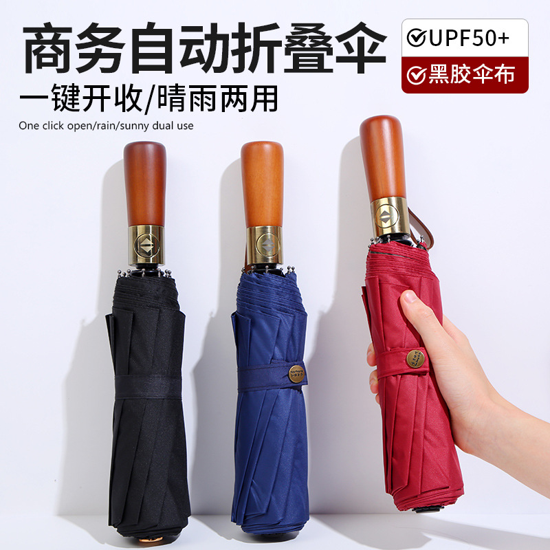 高級木柄ビジネス広告傘カスタム紫外線対策晴雨両用日除け傘一ボタン折り畳み全自動傘