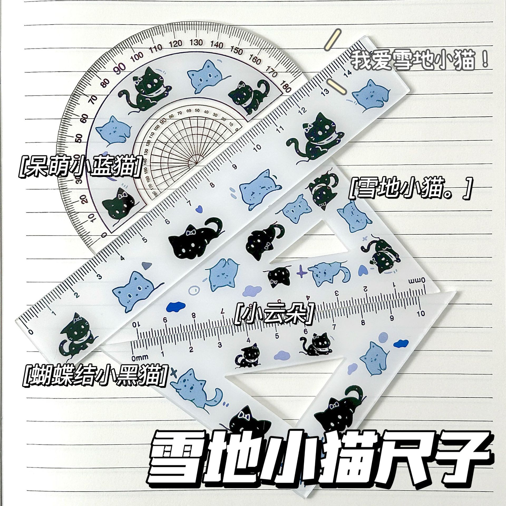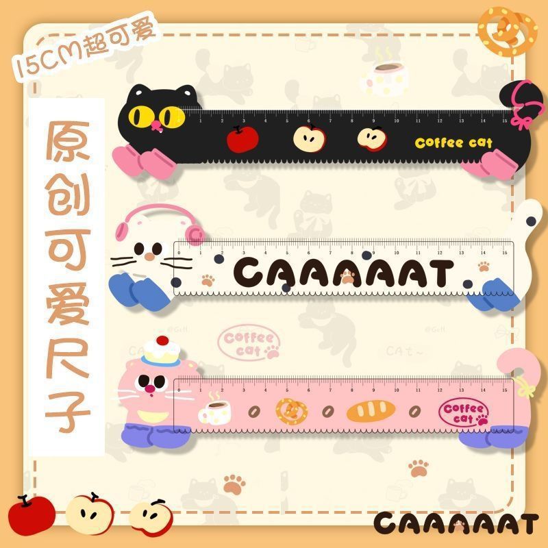 卡通创意猫咪尺子套装ins学生多功能手工测量尺子套装波浪线直尺