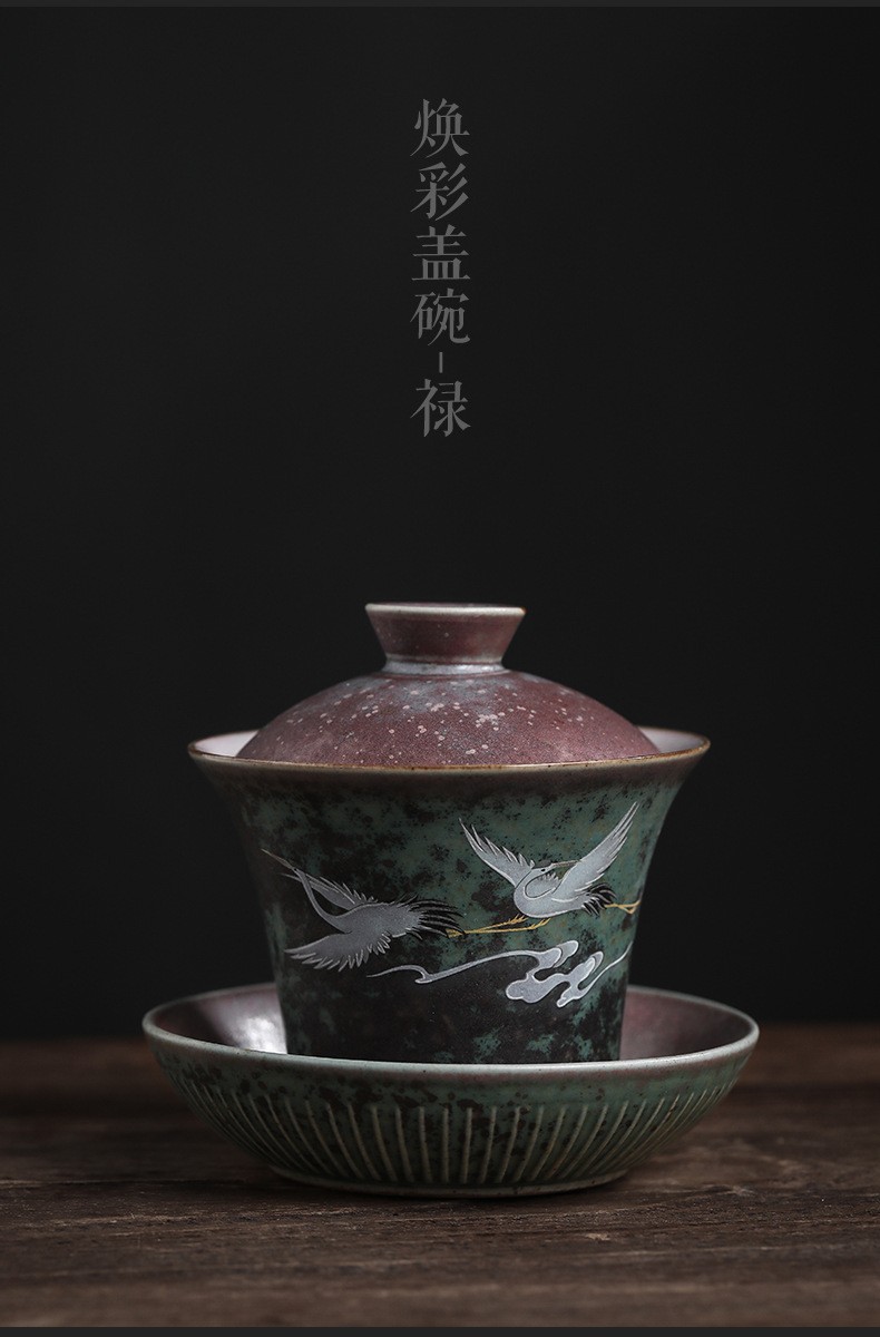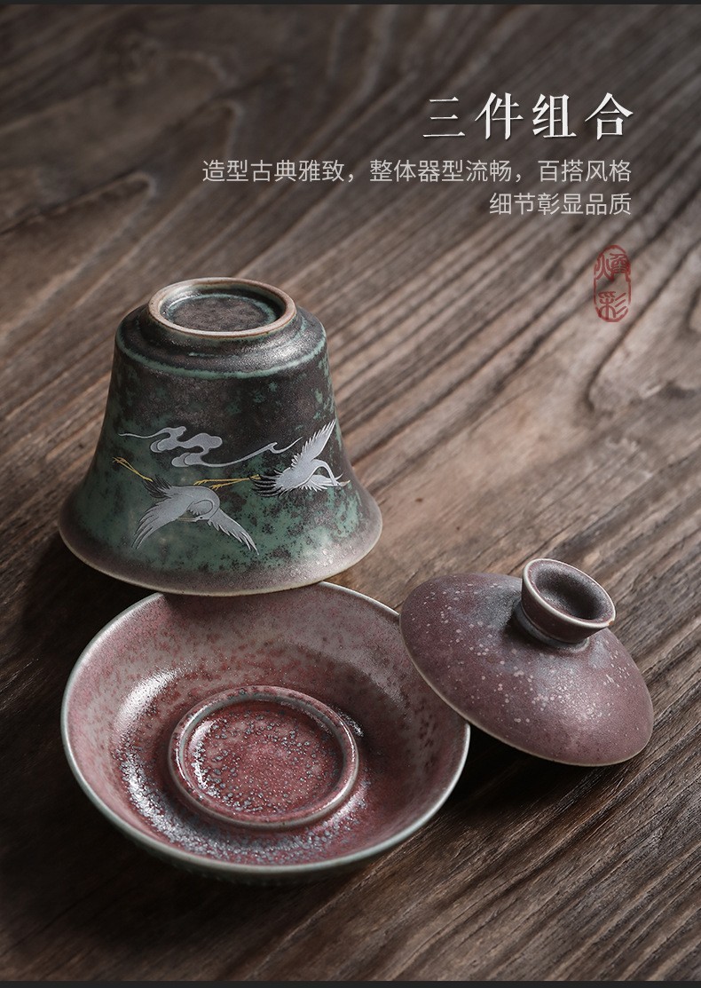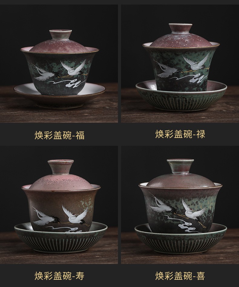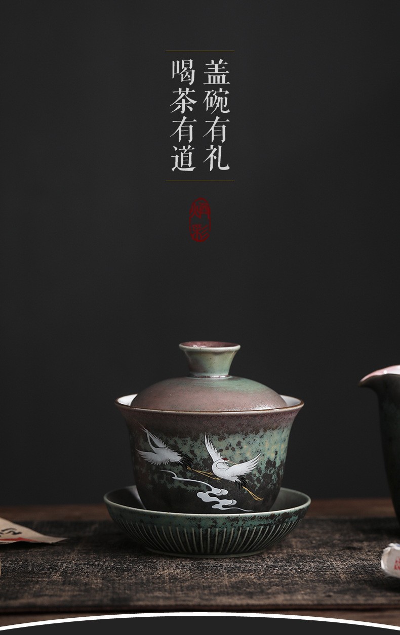 レトロ彩窯変鶴蓋碗創意陶磁器家庭用三才茶碗工夫茶器茶碗分茶器