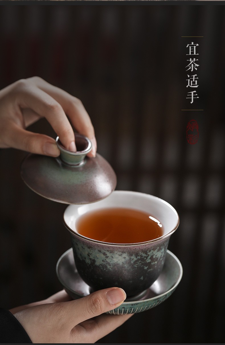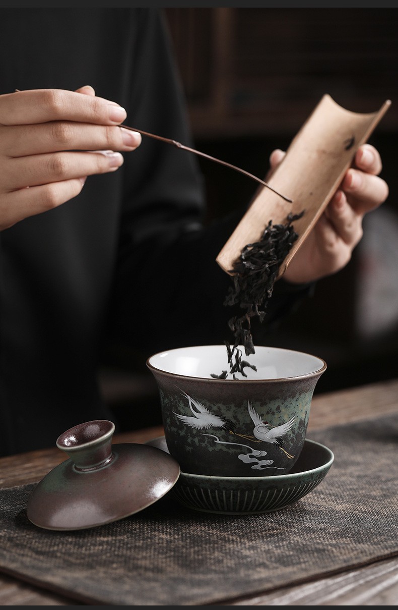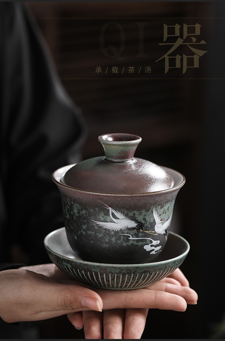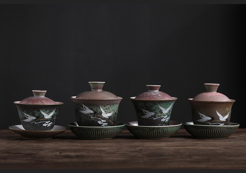 レトロ彩窯変鶴蓋碗創意陶磁器家庭用三才茶碗工夫茶器茶碗分茶器