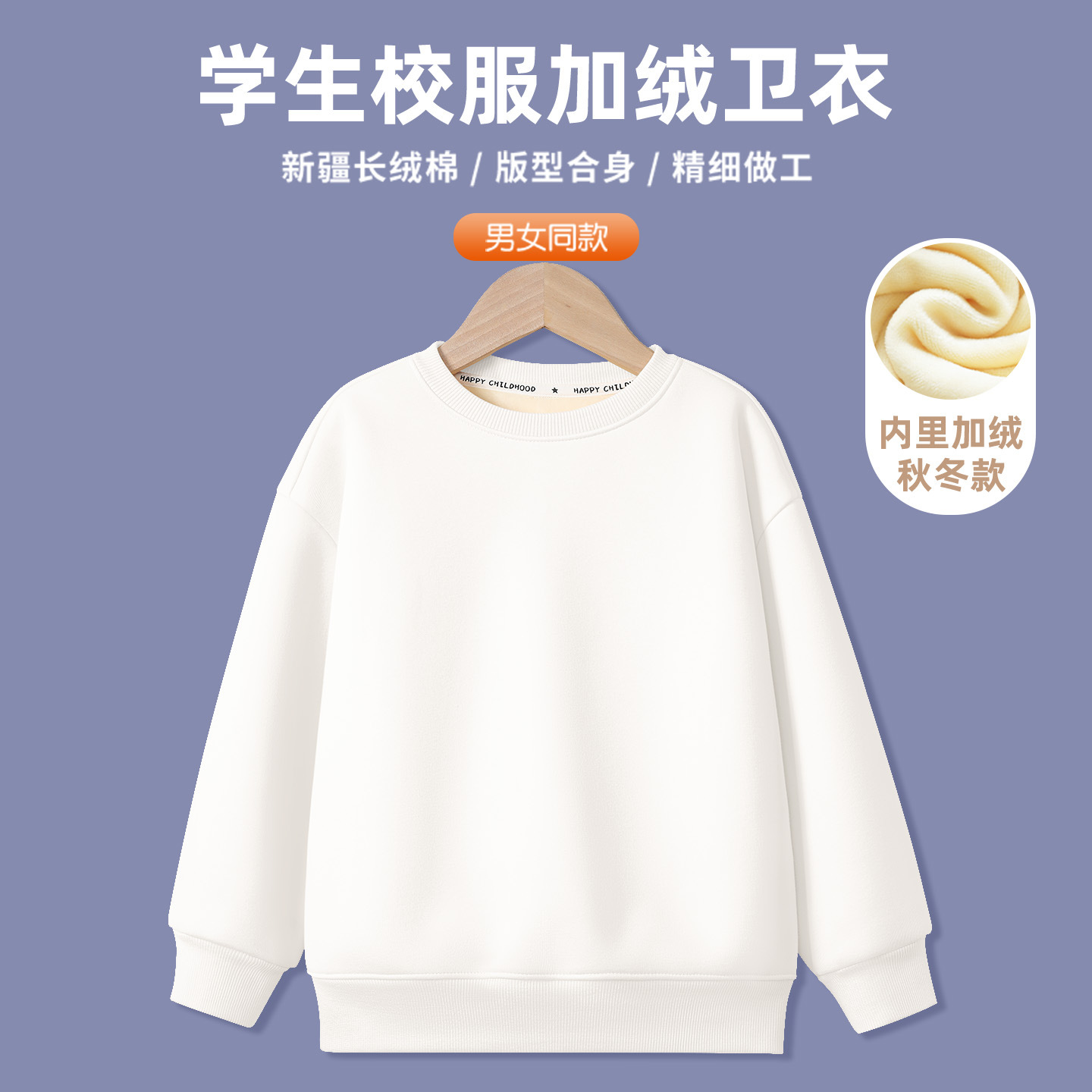 儿童加绒卫衣男女童白色上衣纯色打底衫秋冬小学生校服一体绒长袖