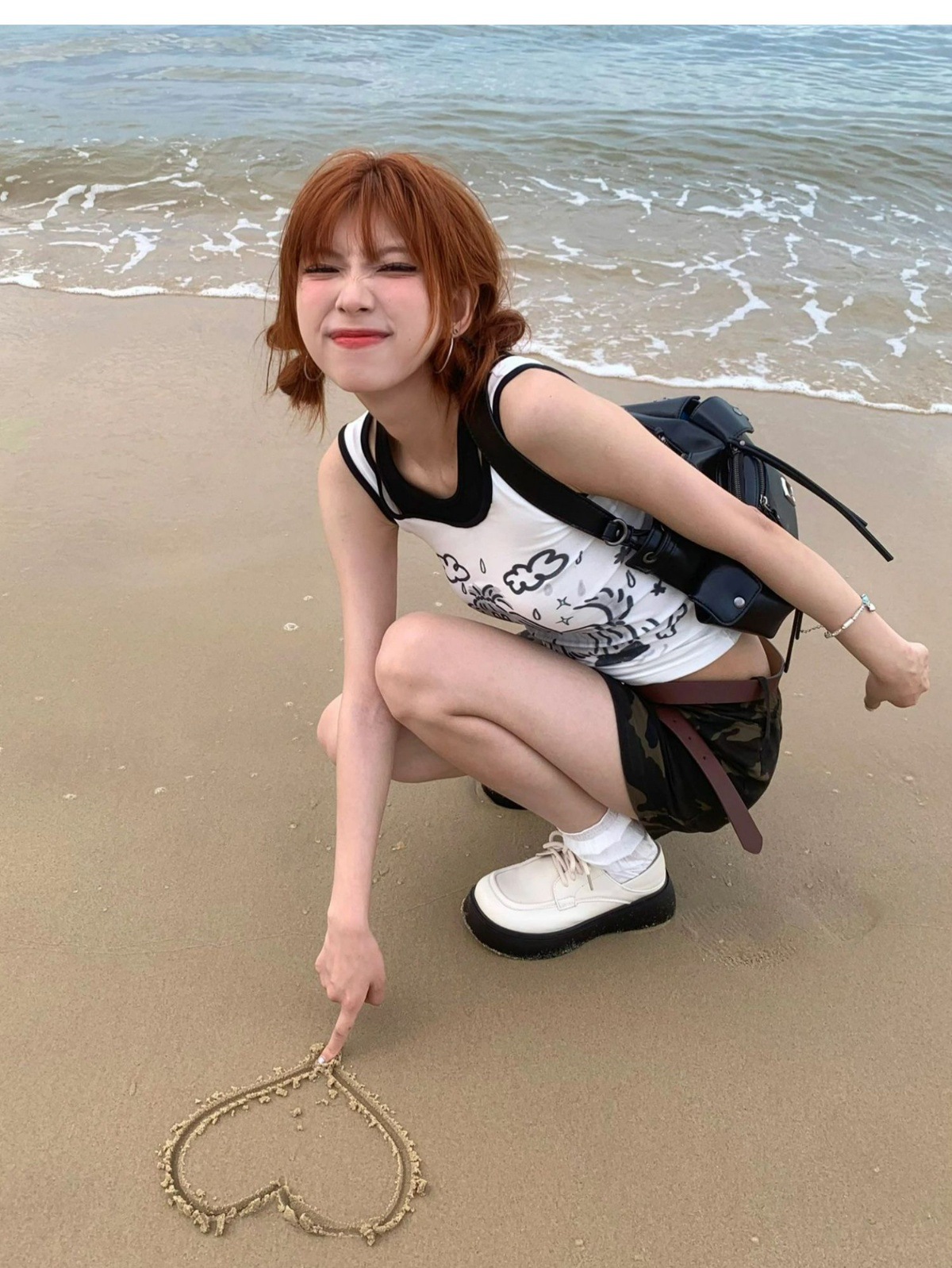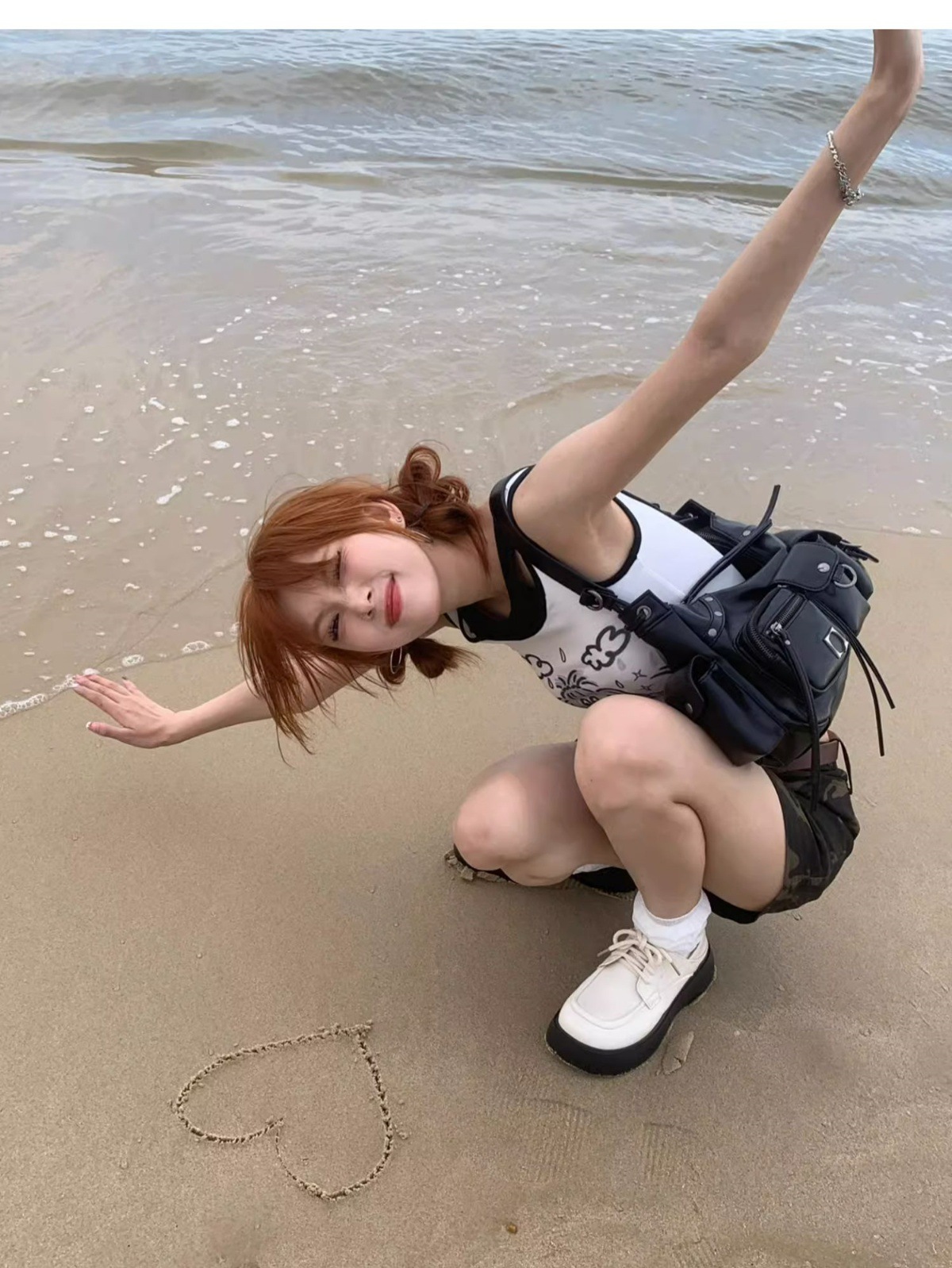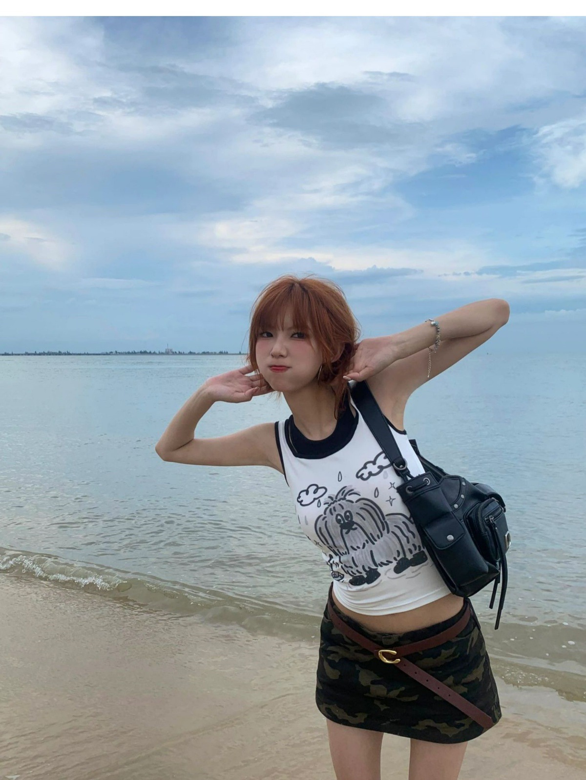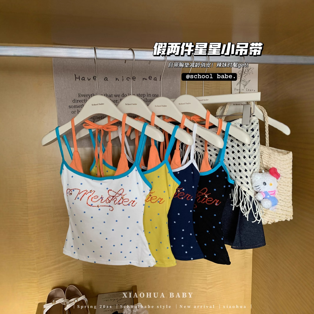 2025新款美式复古烫钻假两件印花吊带背心女夏季修身显瘦百搭上衣