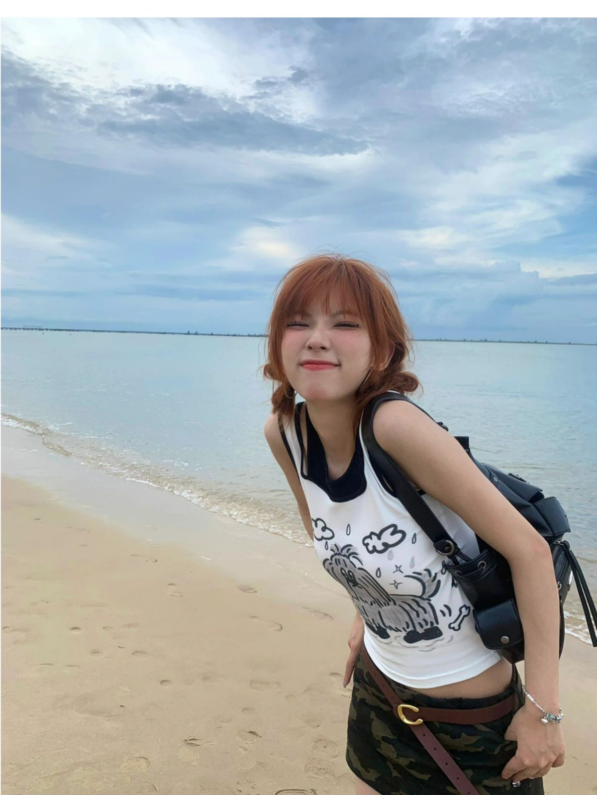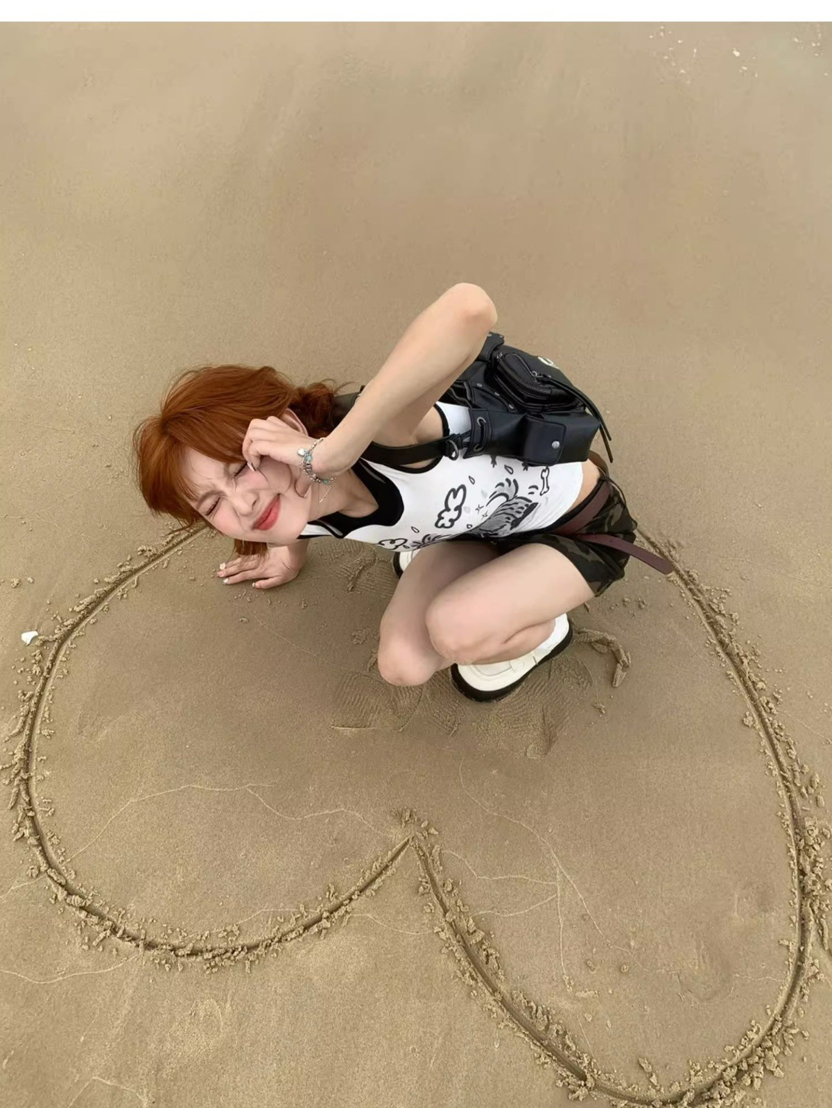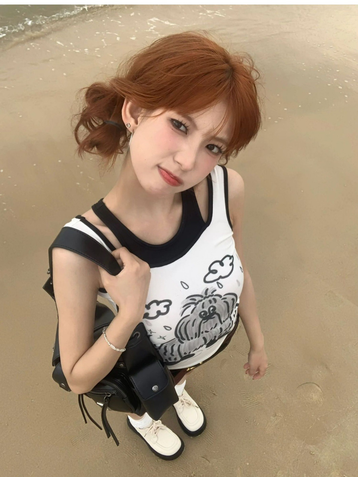 2025新款美式复古烫钻假两件印花吊带背心女夏季修身显瘦百搭上衣