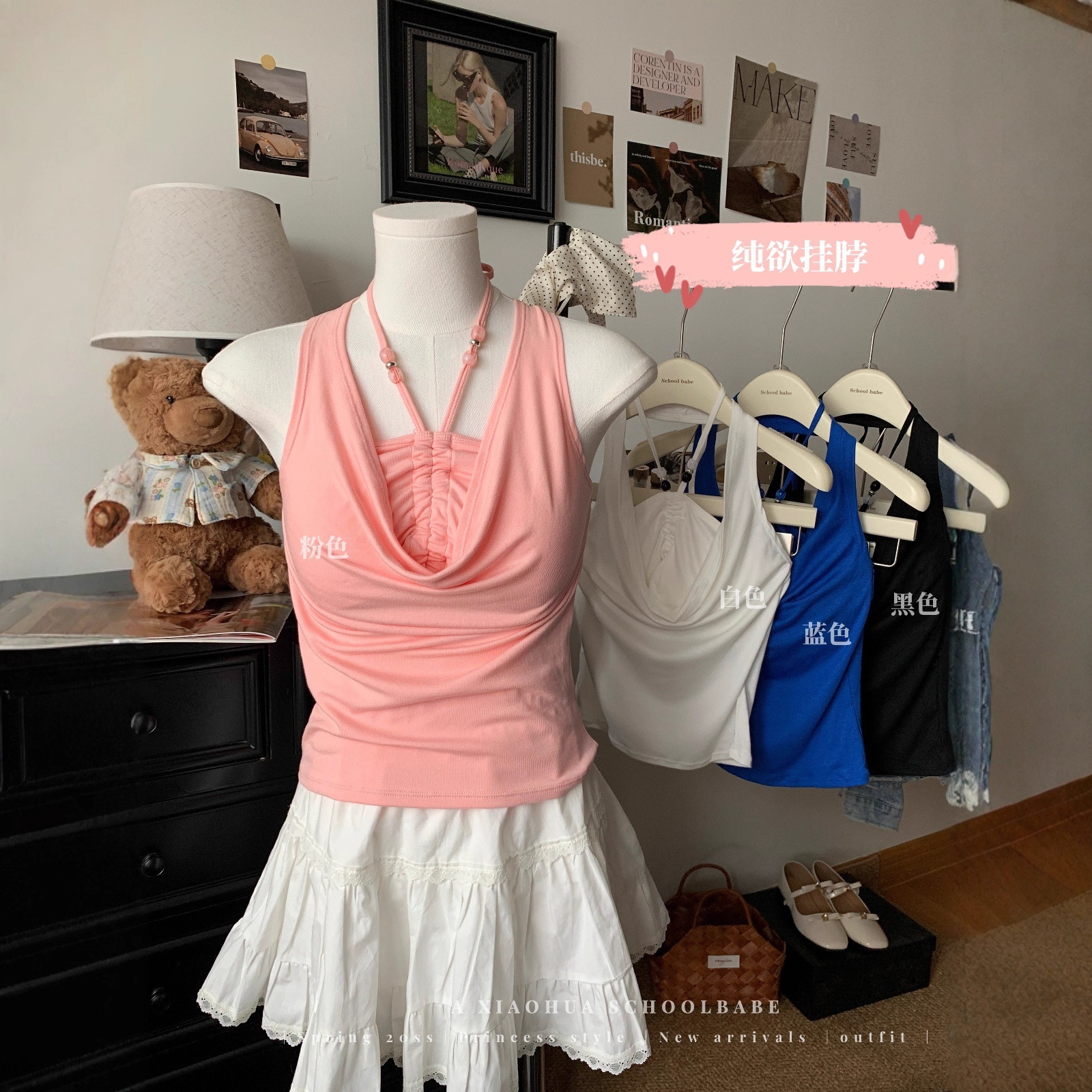 拼接假两件串珠挂脖吊带背心女夏季修身内搭纯欲短款荡领粉色上衣