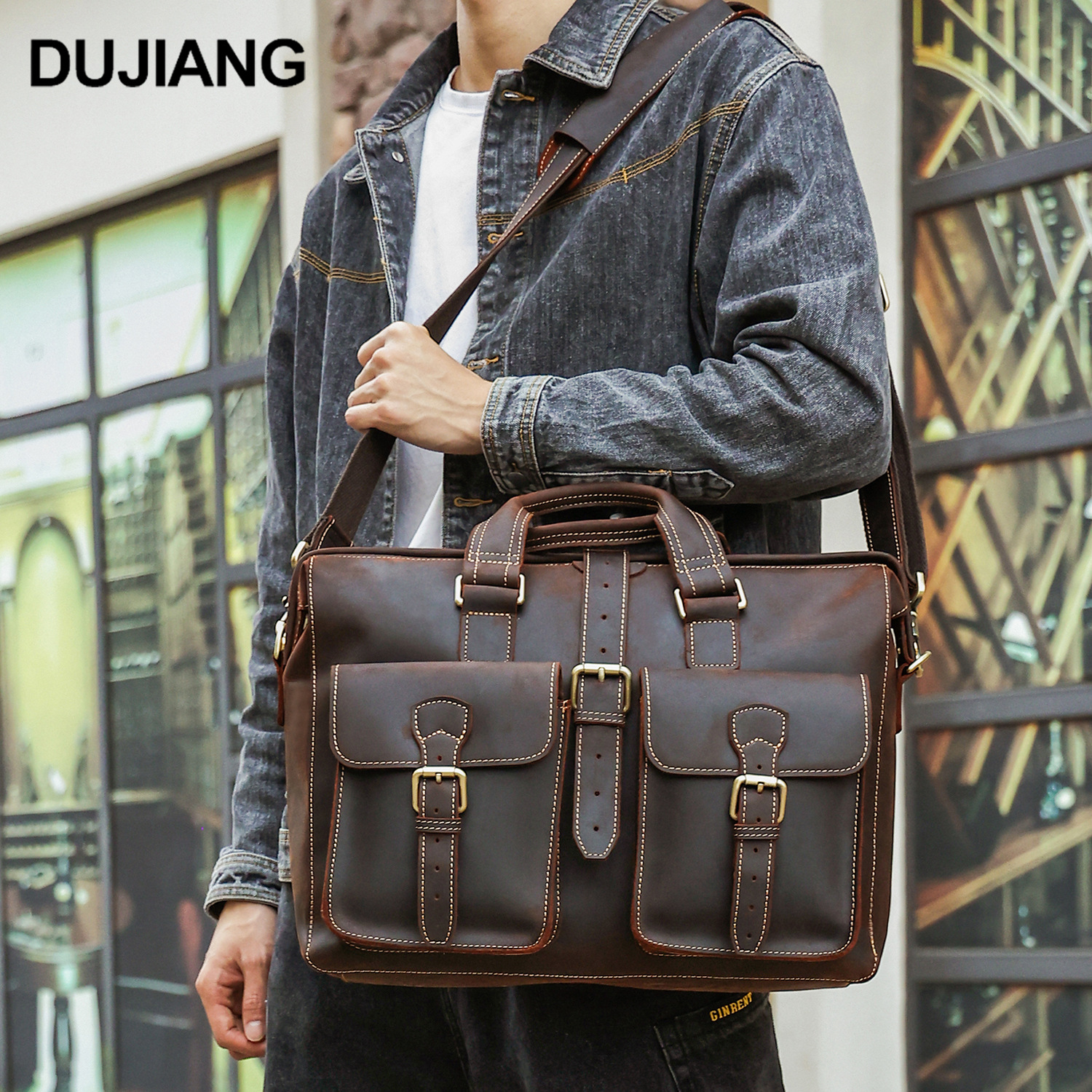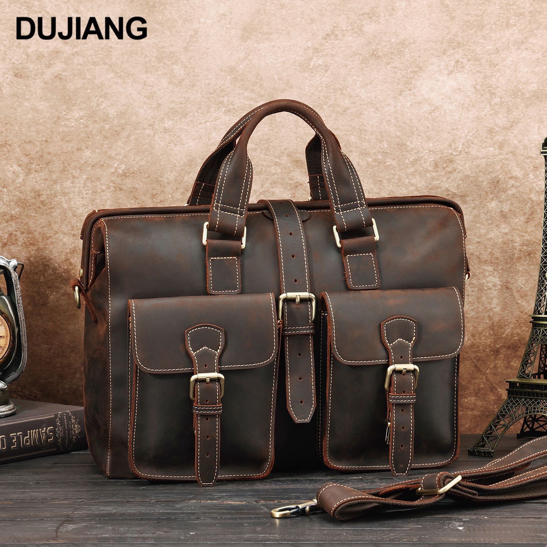 DUJIANG 越境ホット販売コンピュータバッグレトロビジネスメンズハンドバッグ本革メンズバッグクレイジーホーススキンブリーフケース