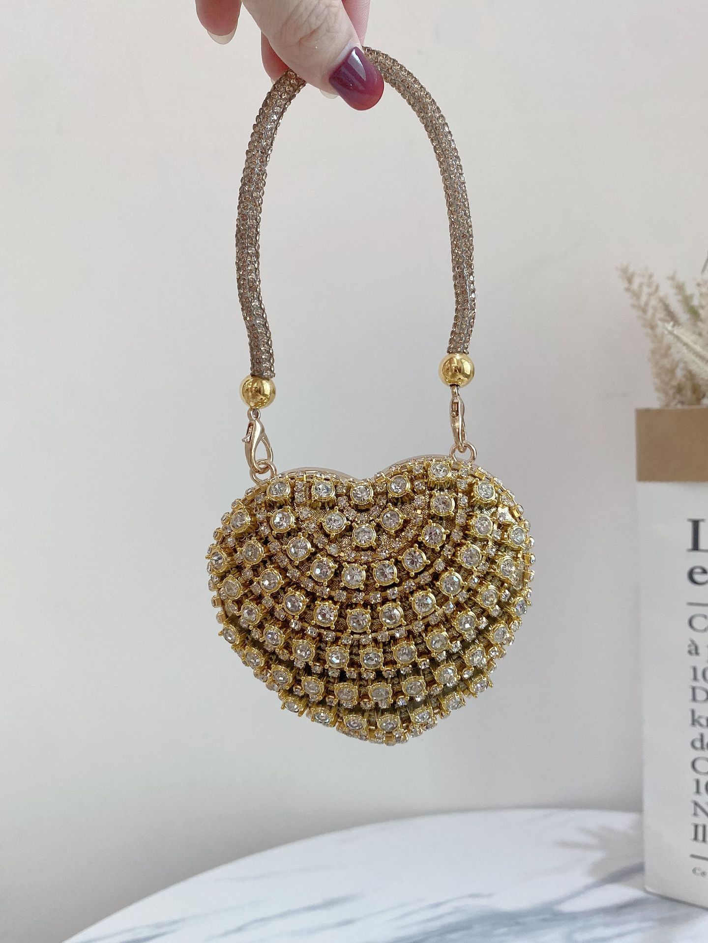ヨーロッパとアメリカの女性のための新しいイブニングバッグ、イブニングパーティー、レンガがちりばめられたクラッチバッグ、ピーチハートの女性用バッグ、ソースファクトリー