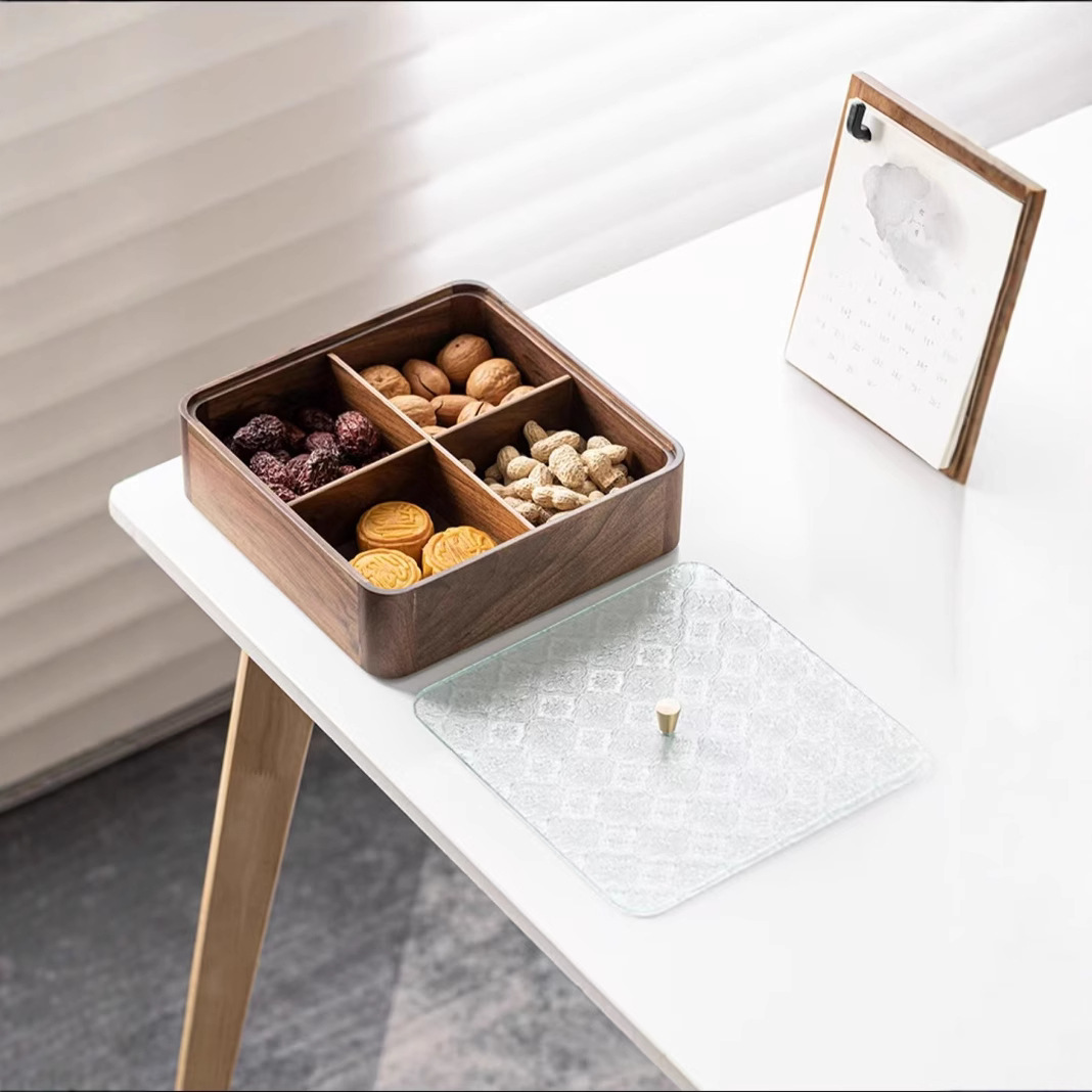 北米黒胡桃実木質瓜子スナック四格ドライフルーツ皿家庭用蓋付きキャンディー箱果物皿収納ケース