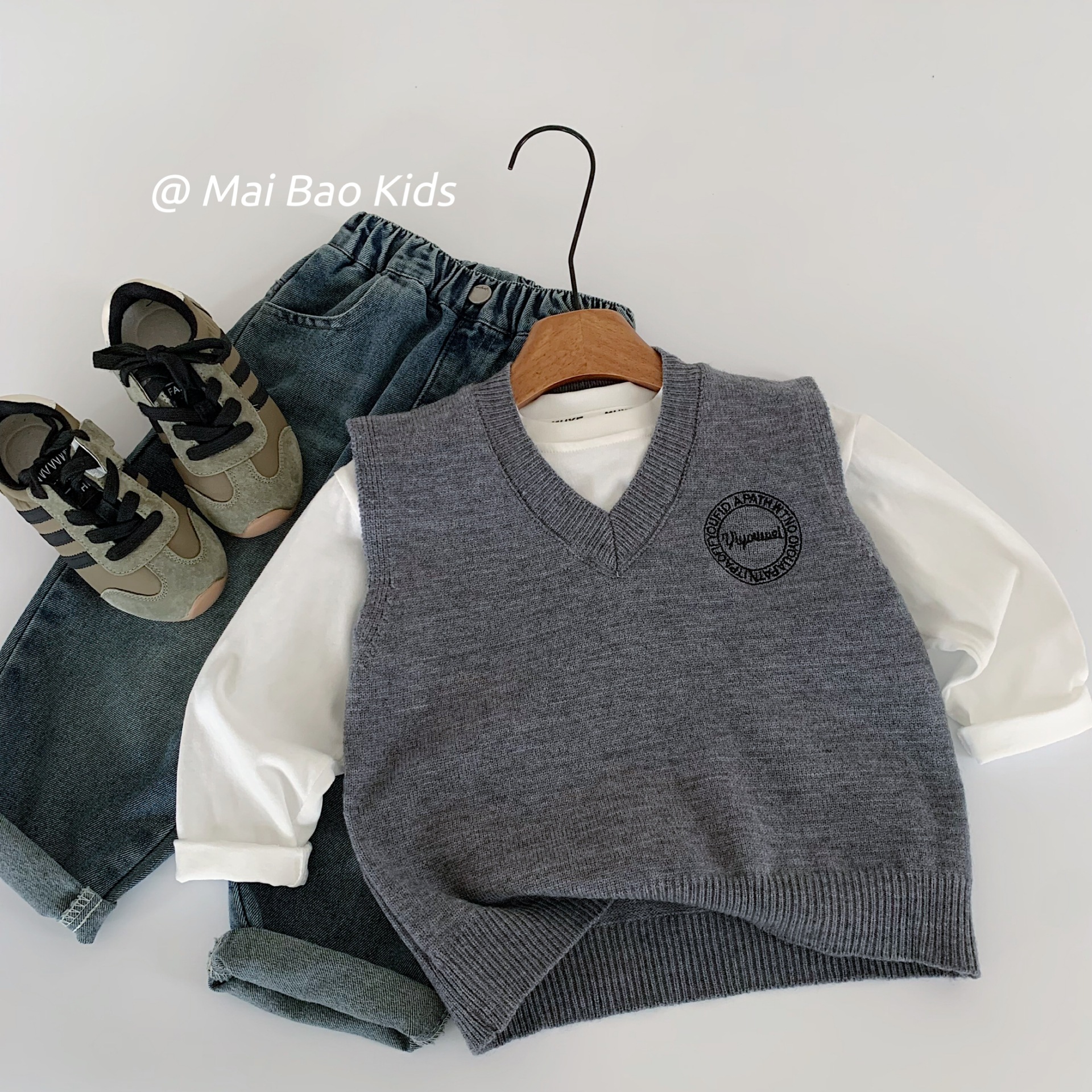 麦宝子供用セーター2026秋新作刺繍入りカレッジ風ジャケット男の子用ベストキャンパス風ニットトップス