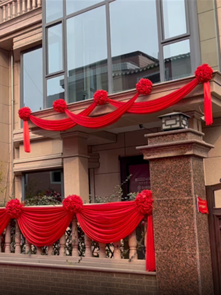 結婚した屋外の新しい部屋の部屋の入り口の装飾ジョーは家のベランダに引っ越して大きな赤い花のボールの波の形の花を配置します。