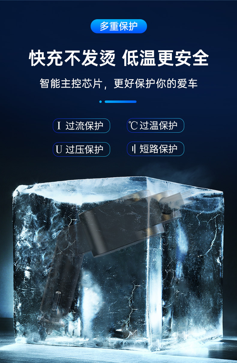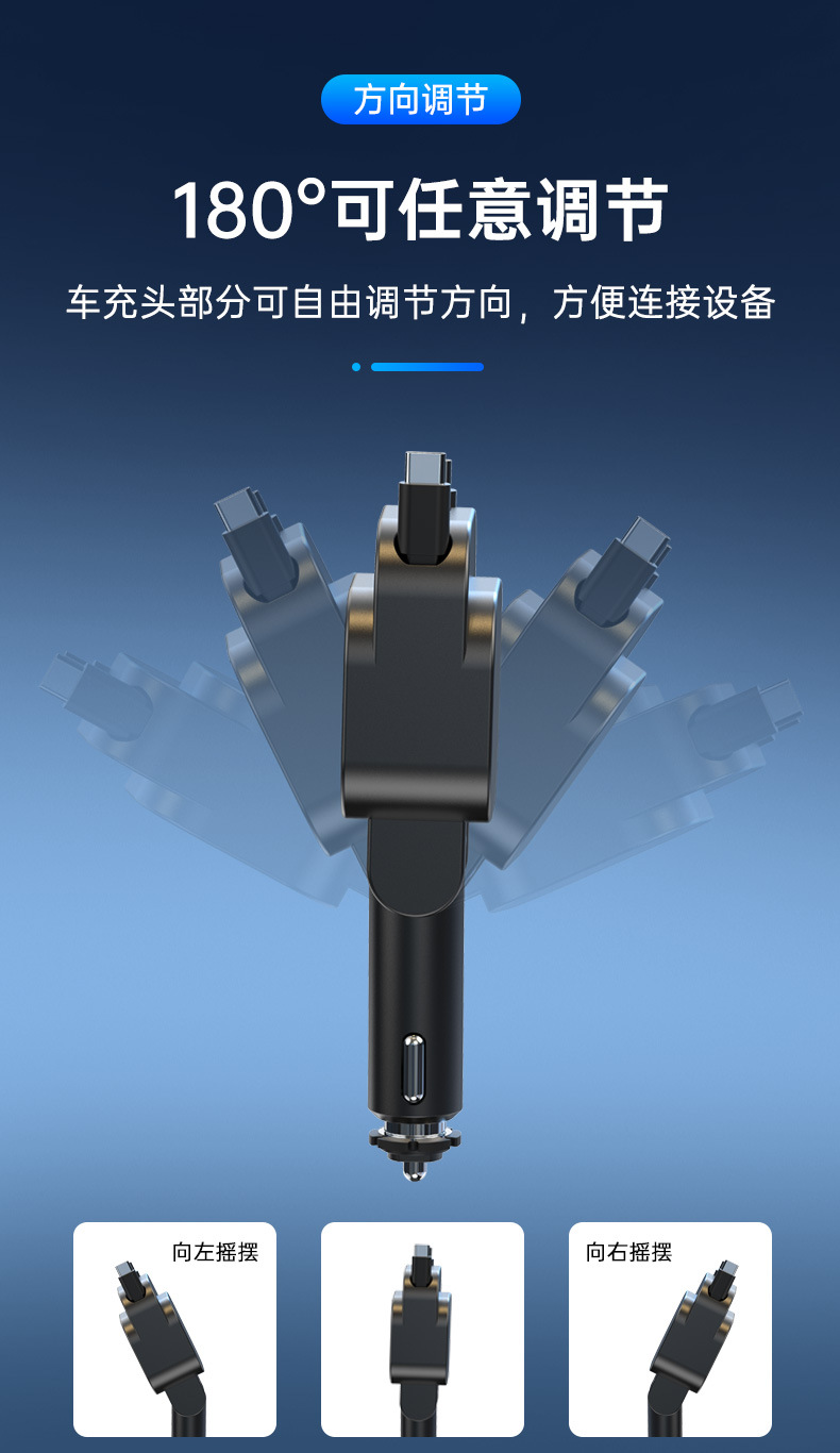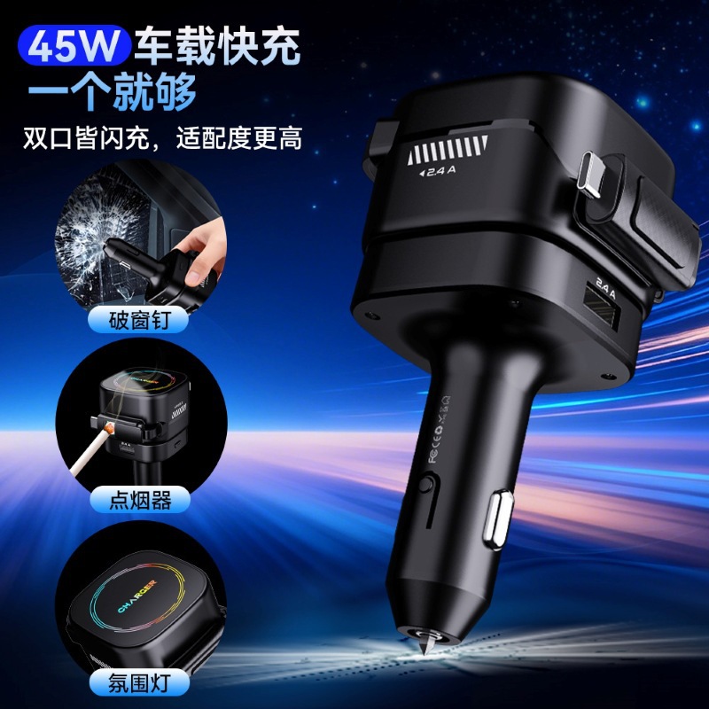 新款E1车载手机充电器自带伸缩线点烟器破窗锤五合一低温快充车充