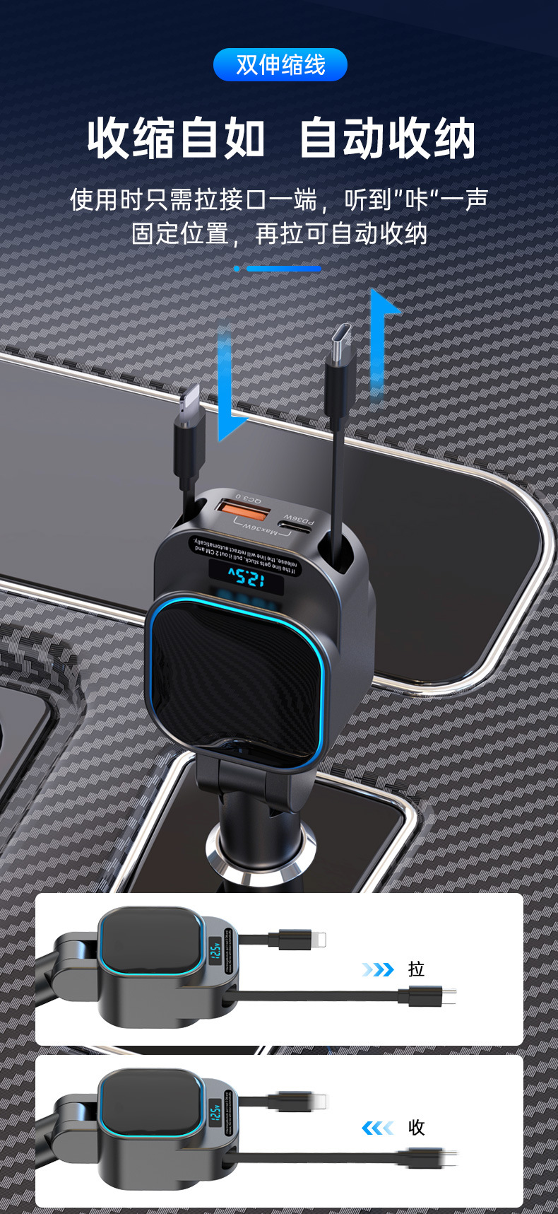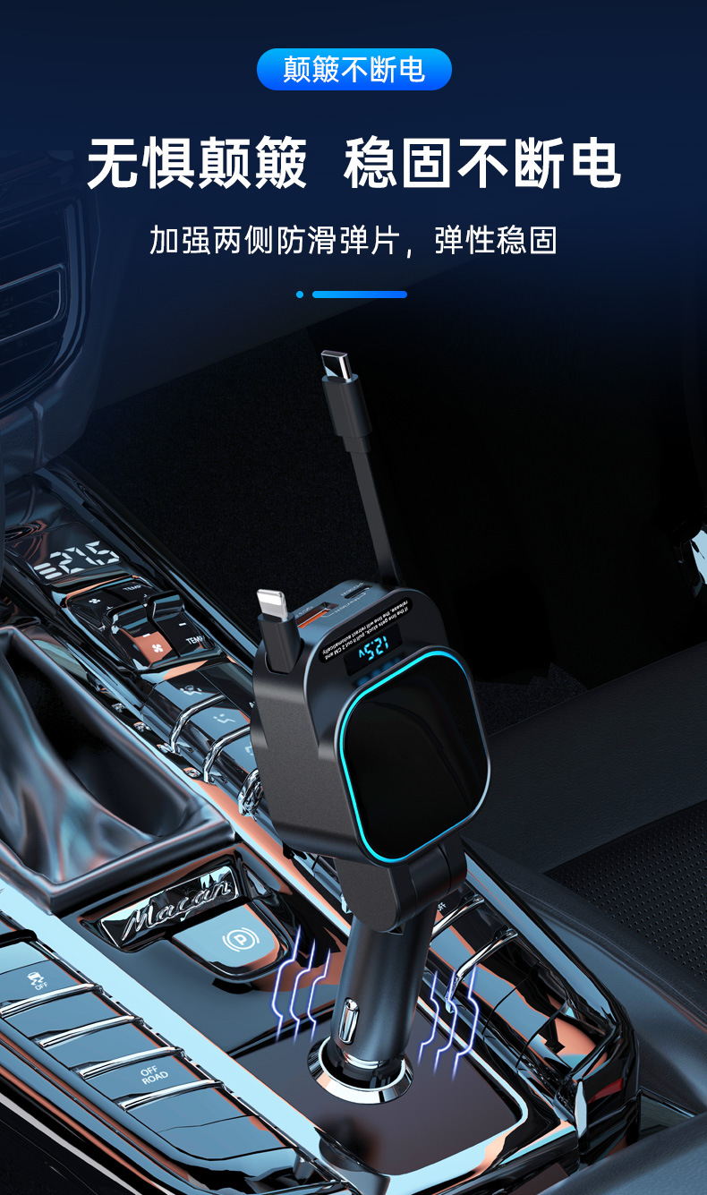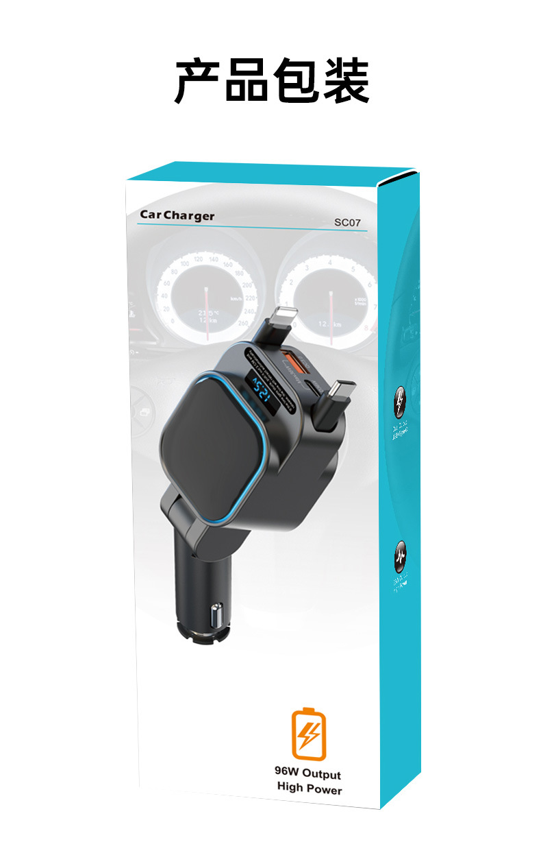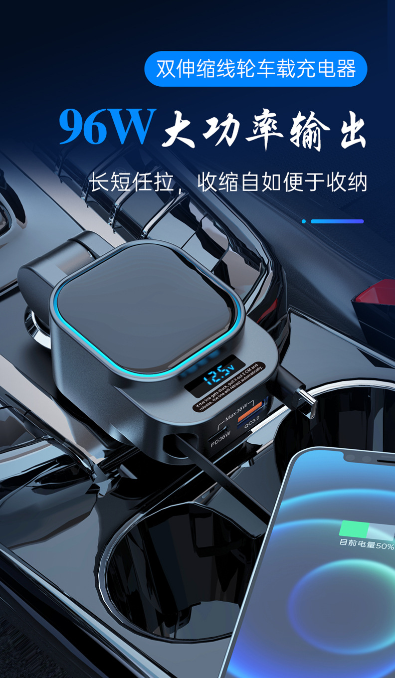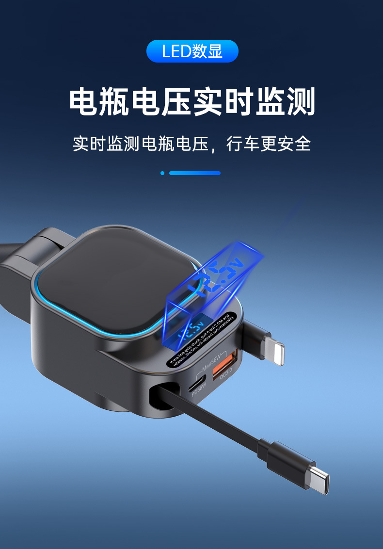 跨境批发独立PD65W汽车车载手机充电器超级快充带伸缩线电压显示