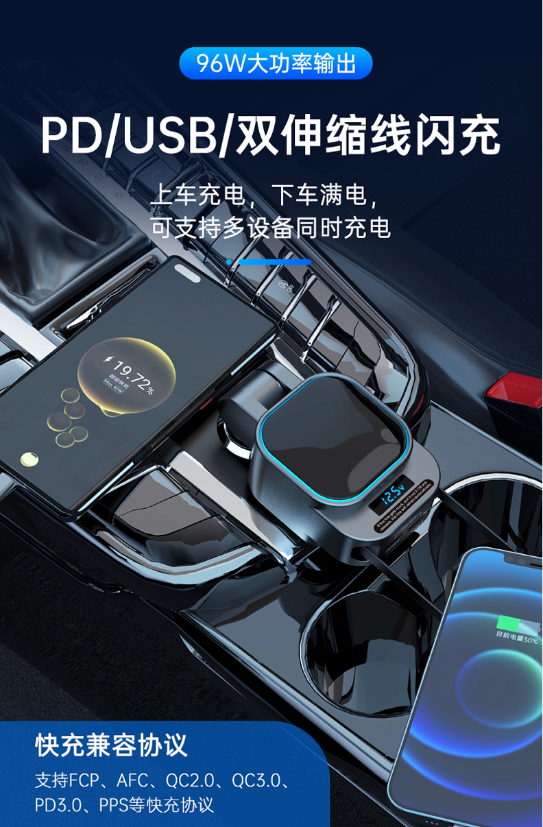 Bc 97車載mp3 bluetooth fm送信機四合一伸縮線車充電96w車載充電器超急速充電