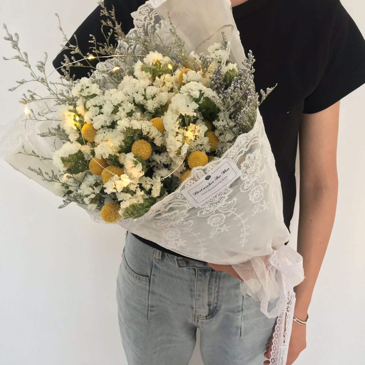 ミックスカラーのレースブーケ、ローズホワイト、グラスなし高さ48cm、人気のレースデイジーホワイトグラスなし高さ48cm、レースブーケ、ライオンローズホワイトグラスなし高さ48cm