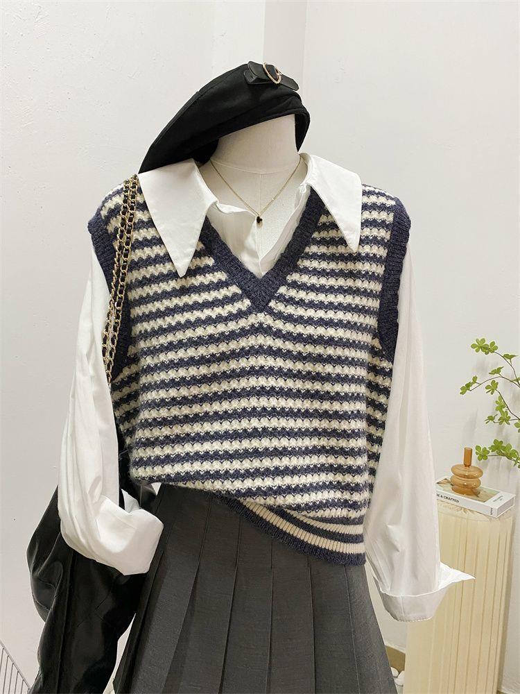2025秋秋设计感小众条纹针织马甲拼接假两件长袖衬衫上衣女宽松潮