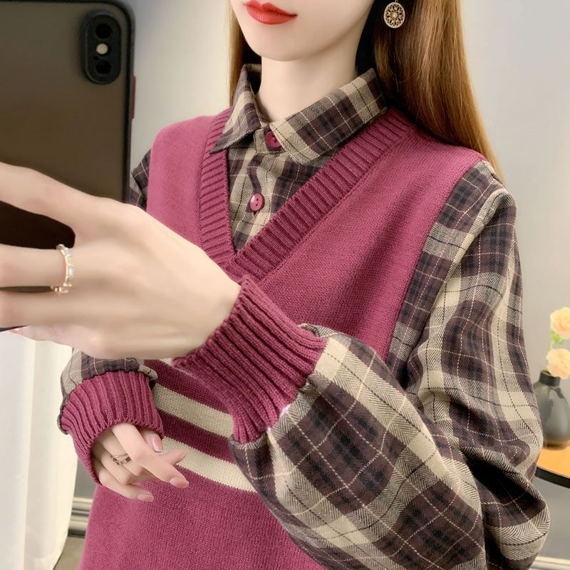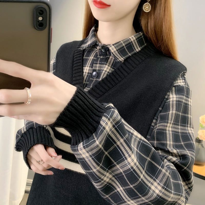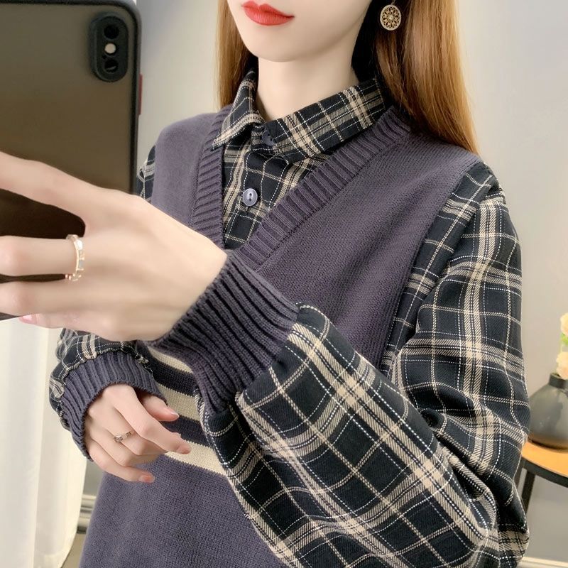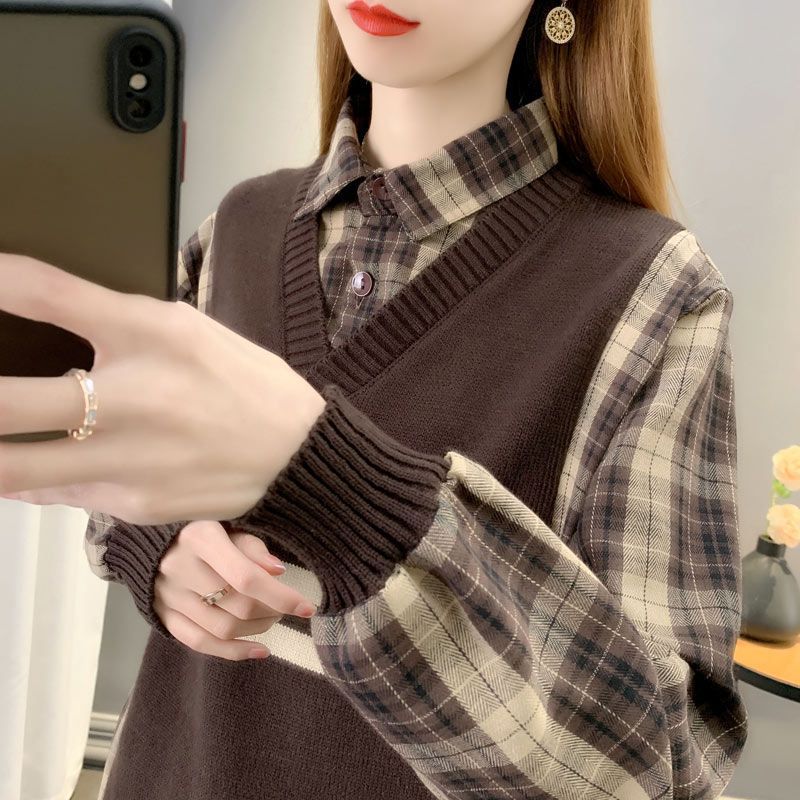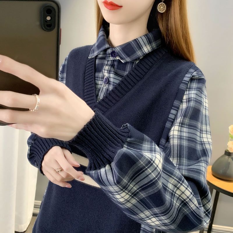 2026年新款春秋假两件毛衣女时尚衬衫领针织衫上衣显瘦洋气打底衫