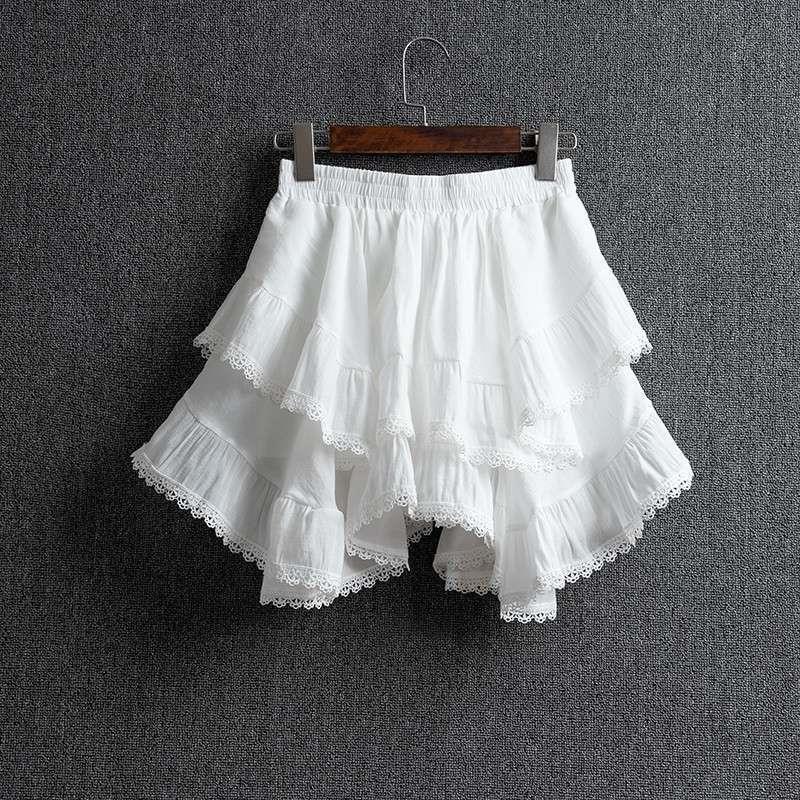 白い綿麻のスカートの婦人服の高腰の百合の対外貿易の蓬蓬のスカートのズボンのスカートの夏の不規則なレースのレース