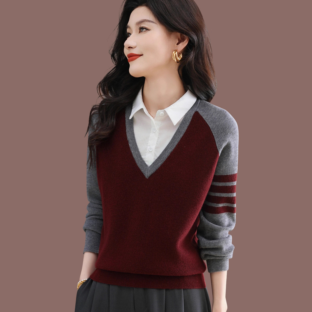 秋冬シャツ襟付きフェイクツーピースセーター レディース 2025新作 ゆったりニットインナー トップス