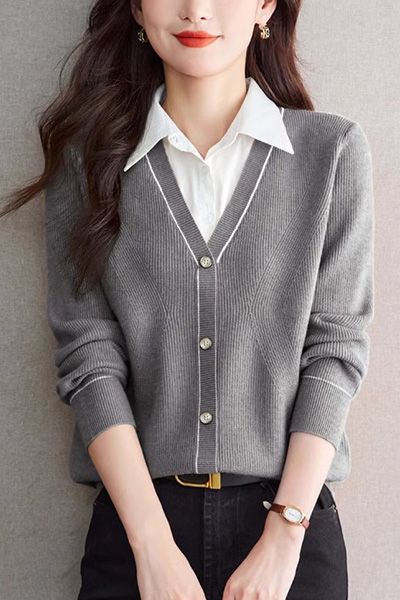 現物ファッションの新商品の洋気2024メリヤスシャツ春と秋の感覚の底のシャツの中に偽の2枚の上着の女性のセーターを掛けます。