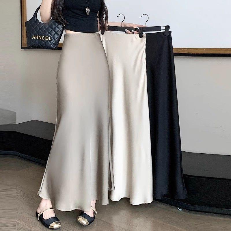 2025春秋のエレガントなフィッシュテールスカート、韓国風サテン生地のハイウエストでヒップをカバーするドレープ感のあるAラインロングスカート