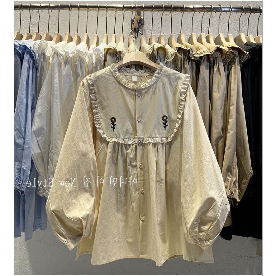 秋冬の女性用ゆったり大きいサイズ、ぽっちゃりさん向け、韓国風刺繍花柄切り替え、森ガール風長袖シャツトップス、ゆったりベビードールシャツ