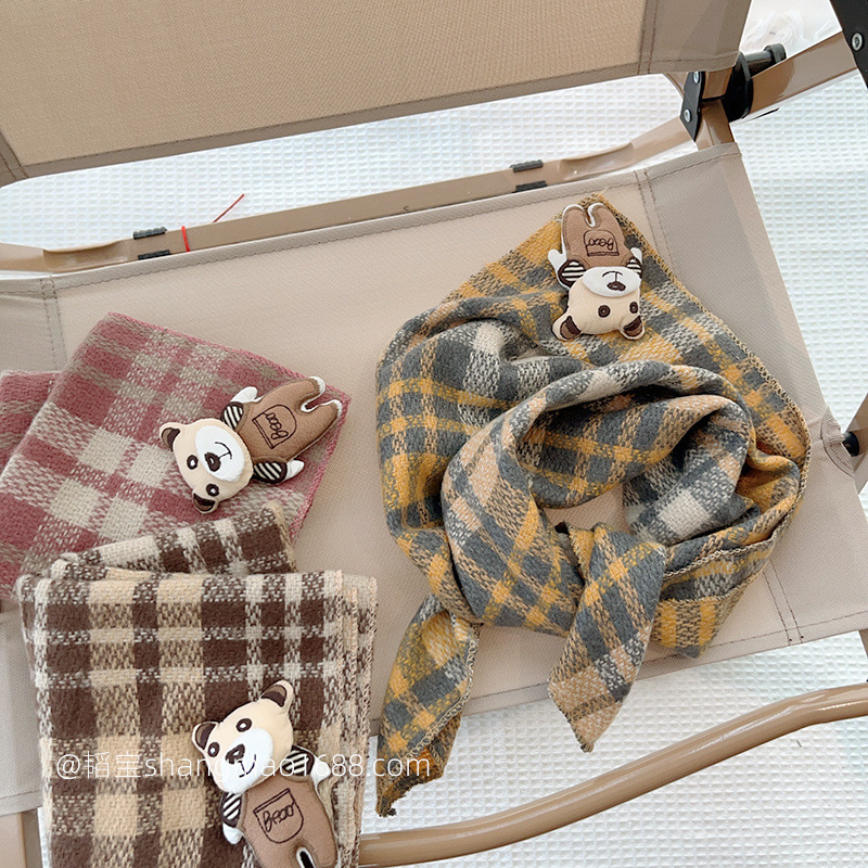 韓国の熊の格子の赤ちゃんの頭巾の男女の子供はマントの三角巾の子供のマフラーの秋冬の保温の防風を合わせます。
