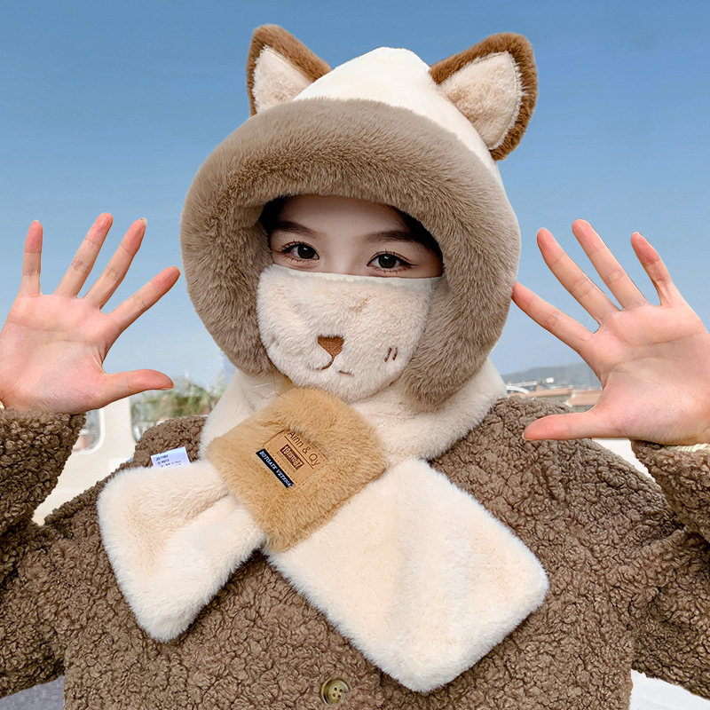 かわいいキツネの帽子のマフラーが一体になっている女性の冬のベルベットの帽子のマスクが帽子をかぶって首を囲んで冬には保温潮が多い