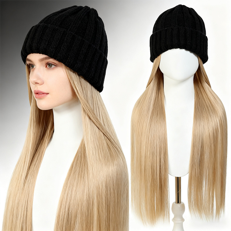 欧美帽子假发一体黑色针织帽金色长直发化纤发全头套帽子假发批发
