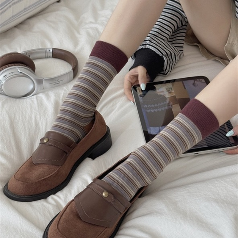 韩版复古森系美拉德撞色条纹中筒袜子女透气秋冬勃肯鞋双针堆堆袜