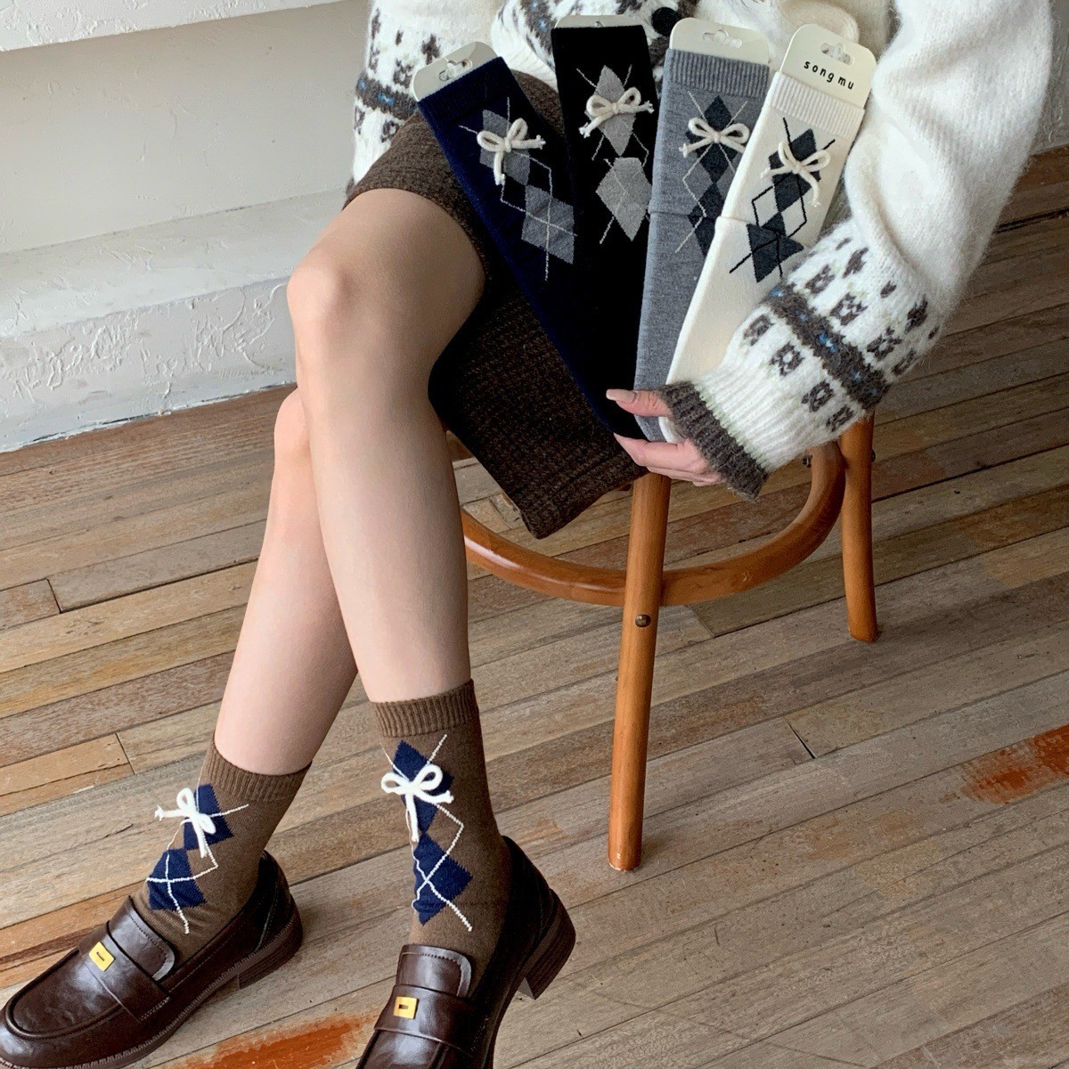 Songmu'韩国袜子女菱格羊毛袜桑蚕丝中筒袜学院风蝴蝶结堆堆袜子