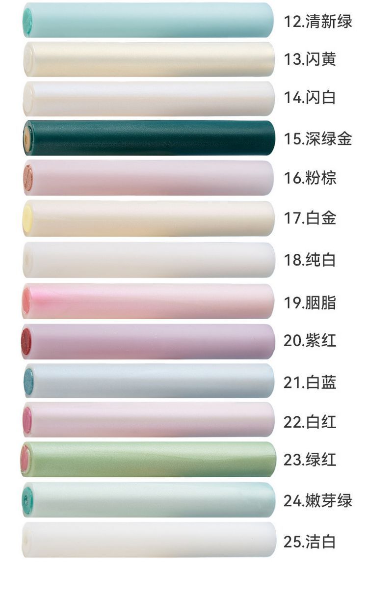 1-ゴールドブルー,2-緑と赤,3-白と黄色,4-青い粉,5-プラチナ,6-バイオレット,7-白と紫,8-ピンク,9-白団子,10-テンダーパウダー,11-レッドゴールド,12-フレッシュグリーン,13-フラッシュイエロー,14-フラッシュホワイト,15-ダークグリーンゴールド,16-ピンクブラウン,17-プラチナ,18-ピュアホワイト,19-ルージュ,20-パープルレッド,21-白と青,22-白と赤,23-緑と赤,24-つぼみグリーン,25-ホワイト
