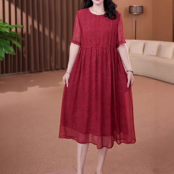 春の夏のファッションカジュアルな大きいサイズの丸首ネットの赤いOOTDは上着の中年のお母さんの太っている240婦人服を生放送します。