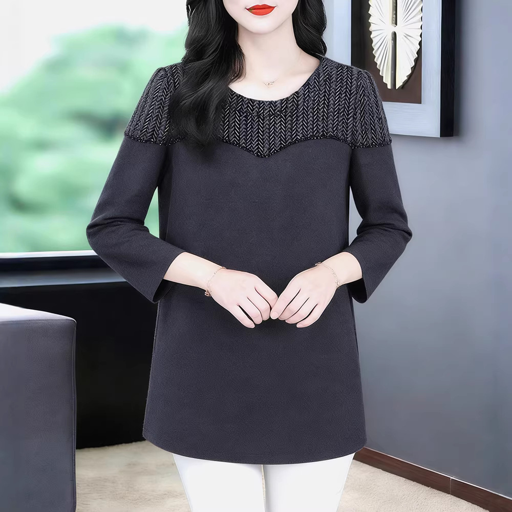 厚手で裏起毛の秋冬向け、ぽっちゃりさん向けの着痩せ効果のある、上品なベルベットジャカードの長袖レースシャツ、中年女性向け