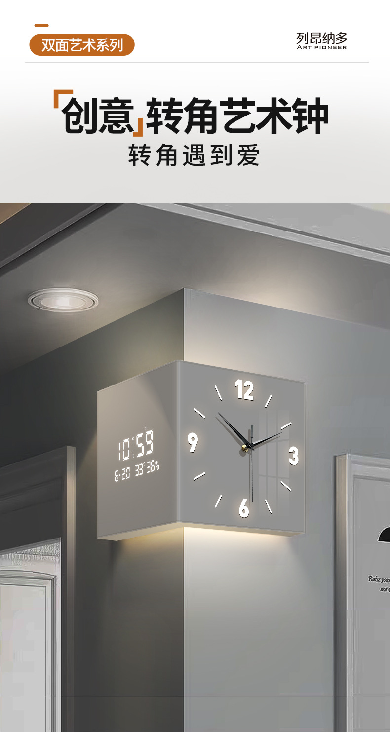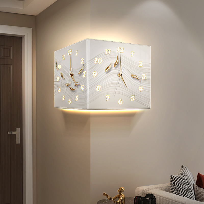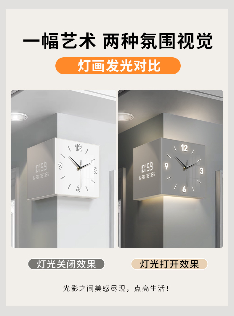 客厅转角时钟万年历电子钟新款双面挂钟创意壁灯拐角挂墙钟表