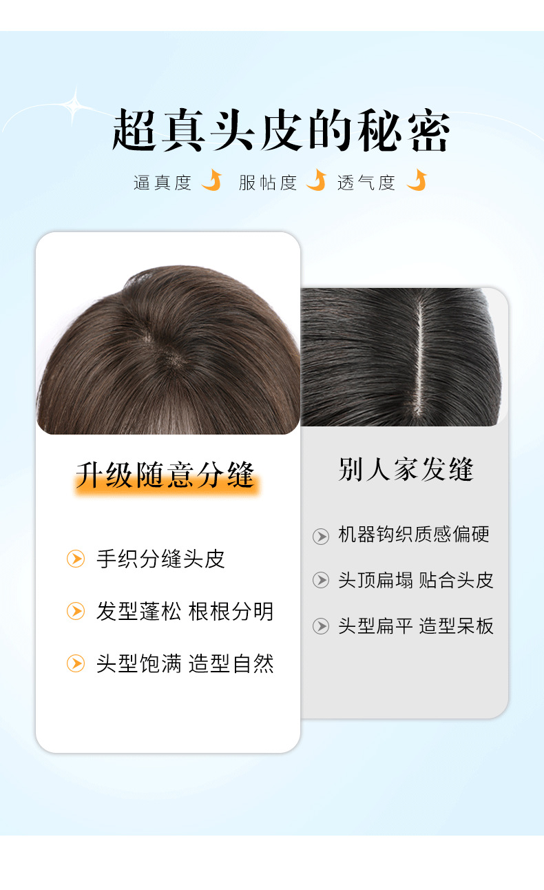かつらの女性の八の字の前髪の頭の上で髪を補います。