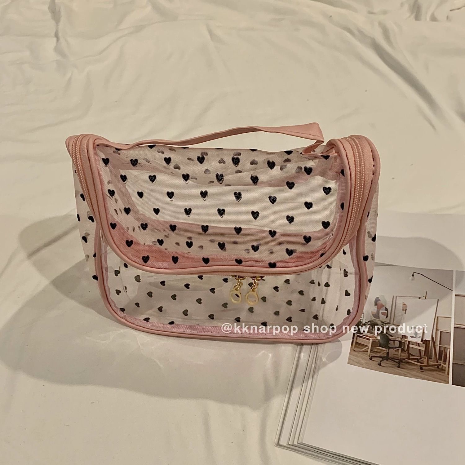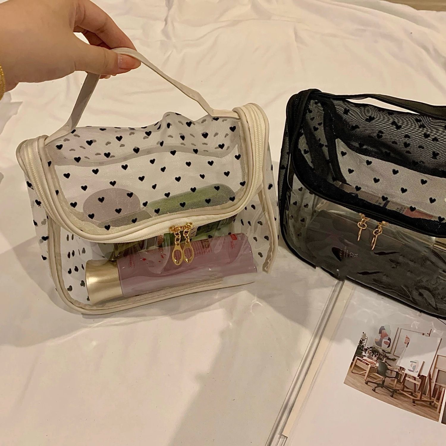 インスタ映えメッシュ化粧ポーチ ハート型収納バッグ 大容量洗面用具バッグ 携帯用化粧品収納バッグ ハンドバッグ