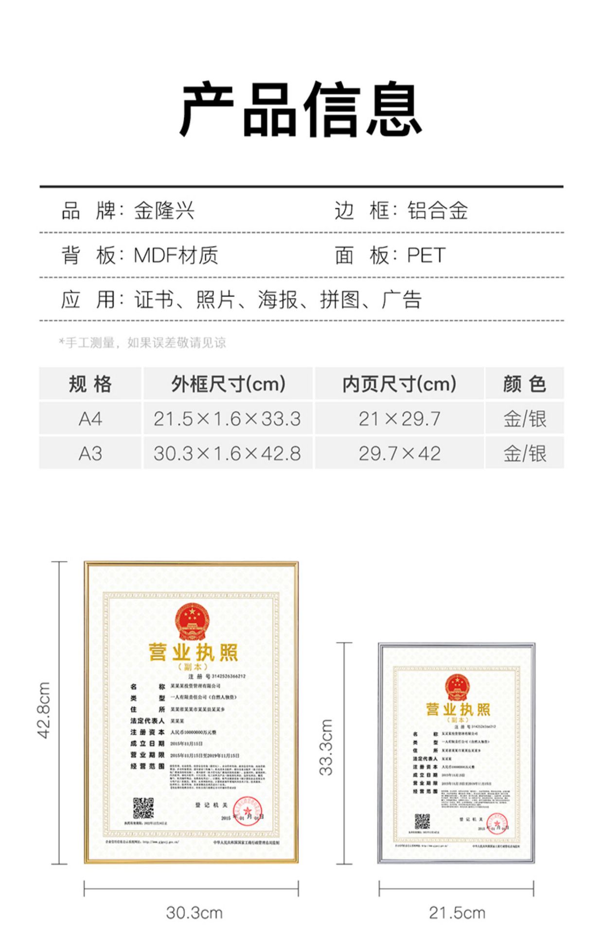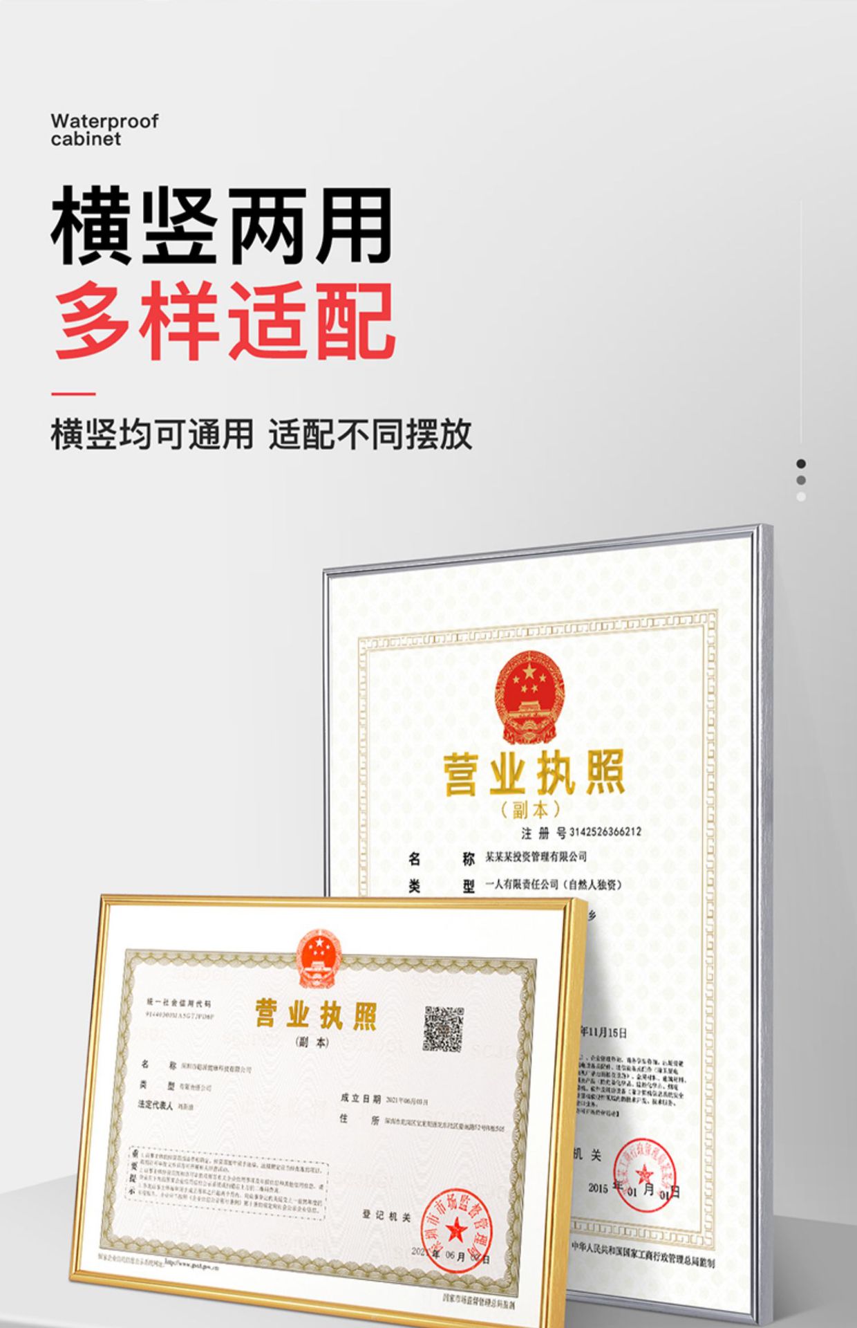 アルミ合金工商営業執照枠a 3保護カバー正本壁掛台証明書食品経営許可フォトフレーム