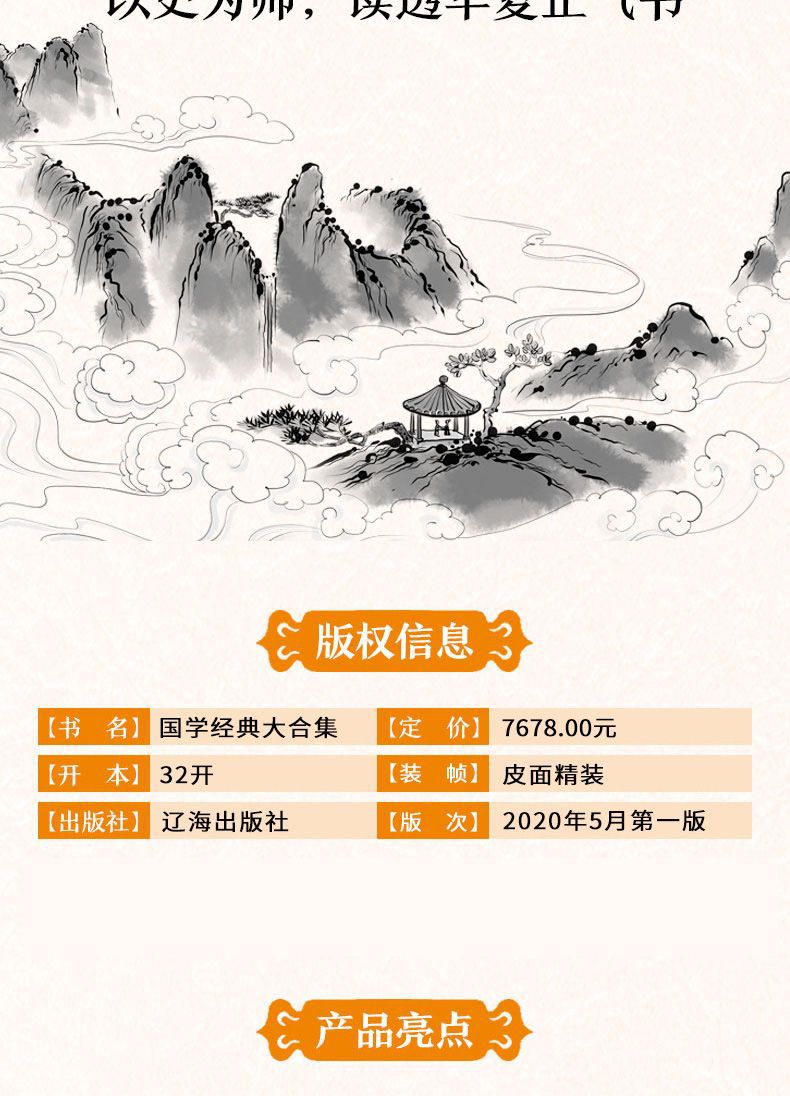 中国五千年(全6巻),歴史記録(全6巻),Zizhi Tongjian (全6巻),二十四史(全6巻),中国通史(全6巻),道経経徹底解説(全6巻),孫子の兵法と三十六計(全6巻),四書五経(全6巻),周易(全6巻),易経徹底解説(全4巻),王陽明全書(全4巻),グイグジ(全6巻),山と海の古典(全6巻),カイゲンタン(全6巻),遼帆の4つの訓練(全4巻),伝統的な中国医学の四大古典(全4巻),唐詩・宋慈・元曲(全6巻),Qianjinfang (全4巻),黄帝内京(全6巻),マテリアメディカ大要(全6巻)