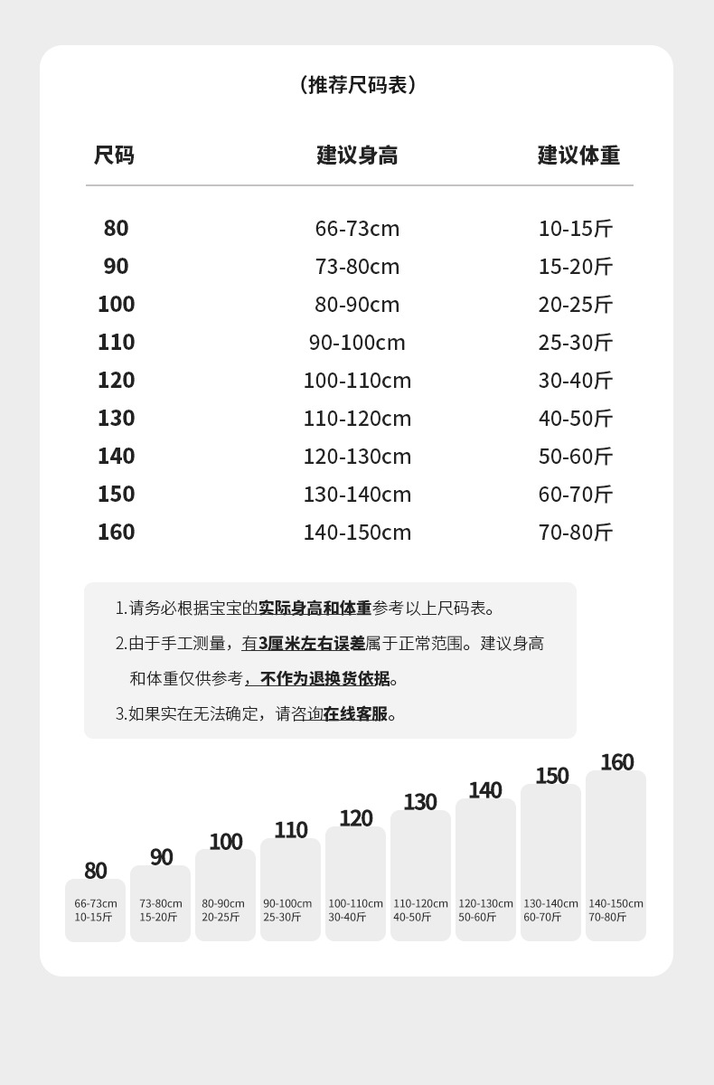 サイズ80、推奨身長66-73cm,サイズ90、推奨身長73~80cm,サイズ100、推奨身長80-90cm,サイズ110、推奨身長90-100cm,サイズ120、推奨身長100~110cm,サイズ130、推奨身長110-120-cm,サイズ140、推奨身長120-130cm,サイズ150、推奨身長130-140cm,サイズ160、推奨身長140-150cm