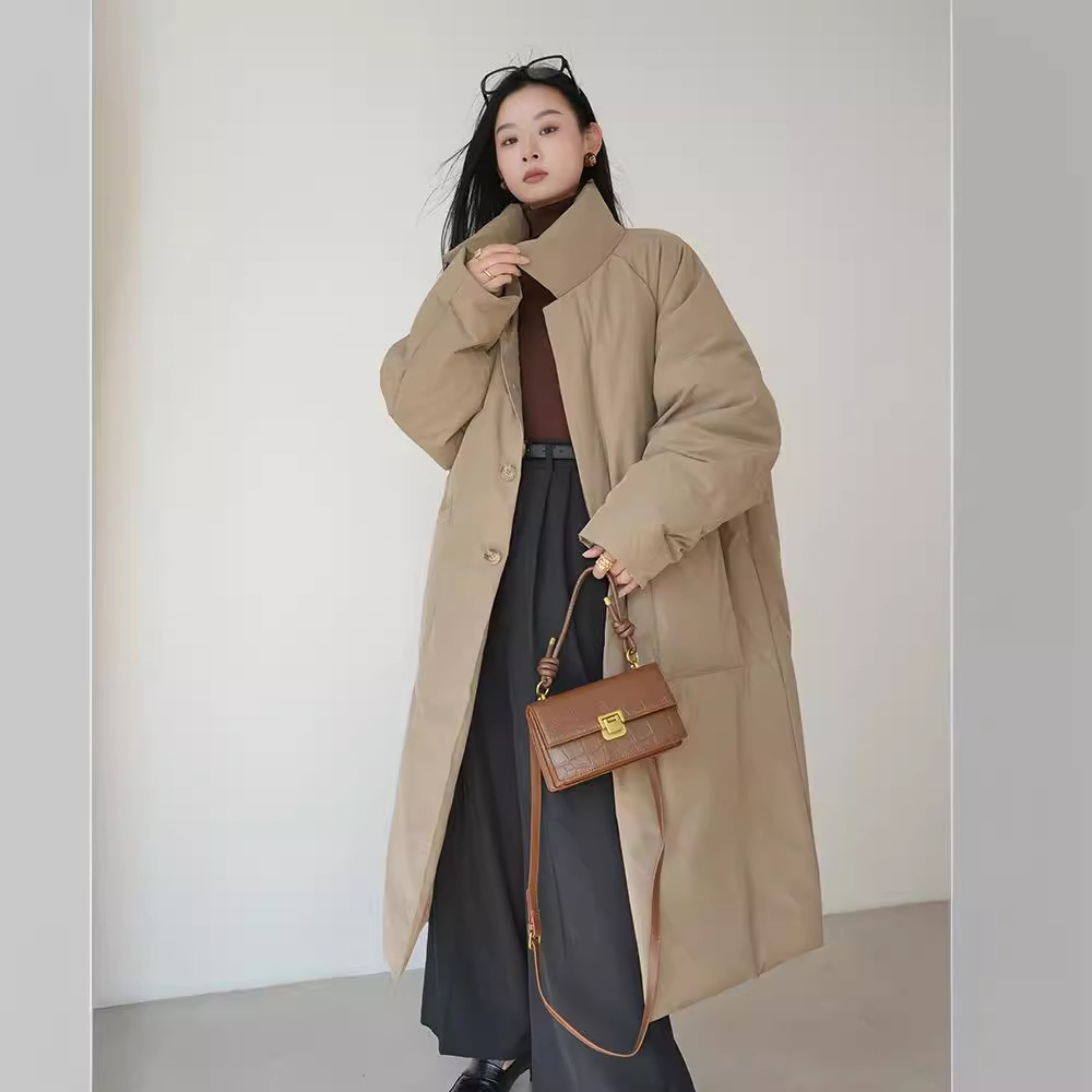 2025年冬 カップル向け 厚手 ロングダウンコットンジャケット 男女兼用 スタンドカラー フード付き 暖かい ゆったりコート