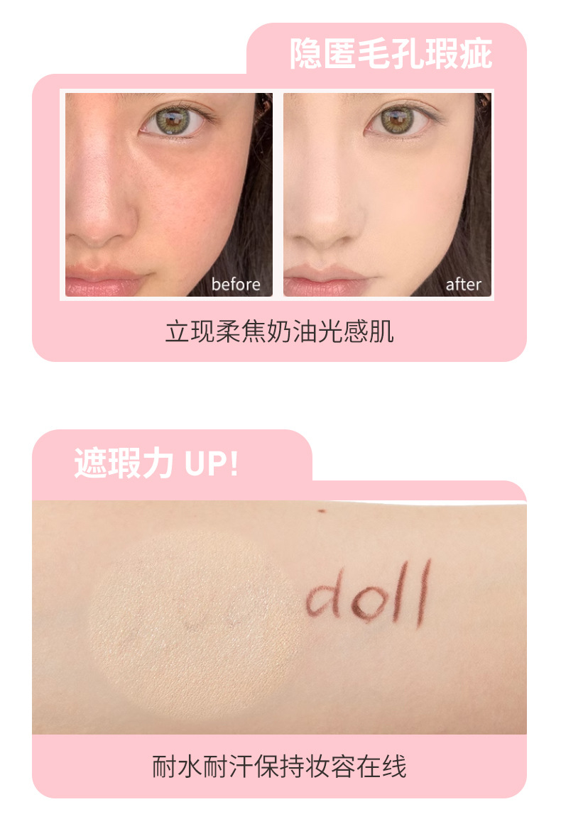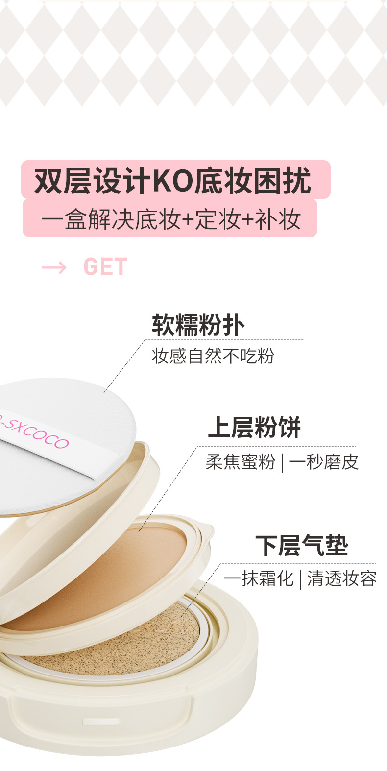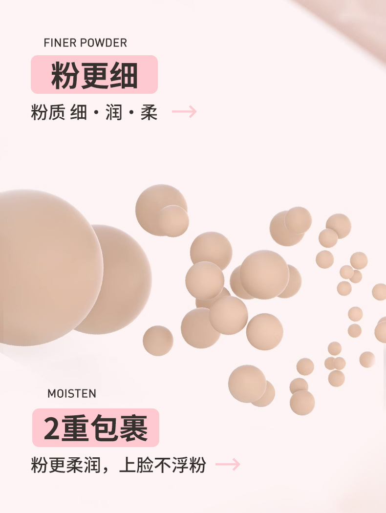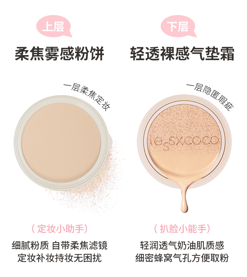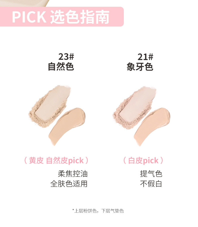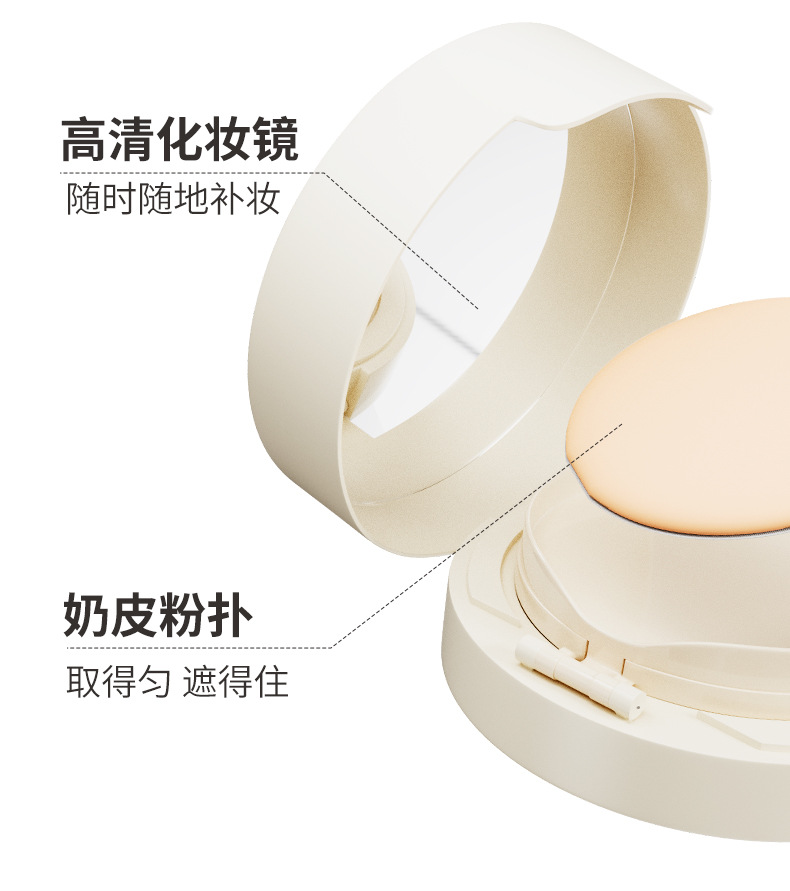 产品介绍:粉饼气垫二合一小巧设计,外出携带不占位置,时刻保持通透奶雾肌妆效。上层粉饼,柔雾哑光,定妆服帖不拔干,控油匀净通透好妆感。下层专研保湿成分,多重精粹入妆,面霜级养肤,上妆自然轻薄,隐匿毛孔,遮盖痘痕,净透裸光肌。一盒搞定上妆+定妆+补妆,轻松打造精致服帖自然裸妆。