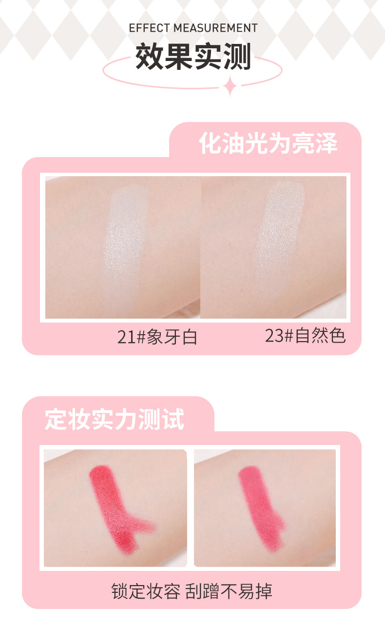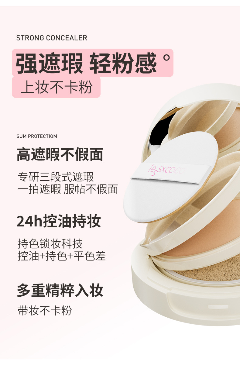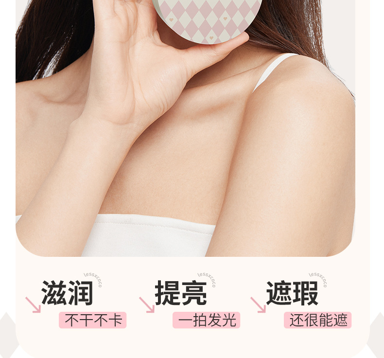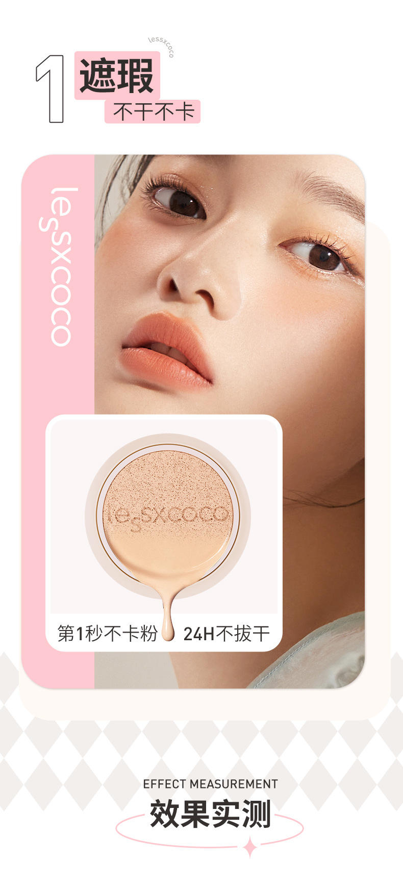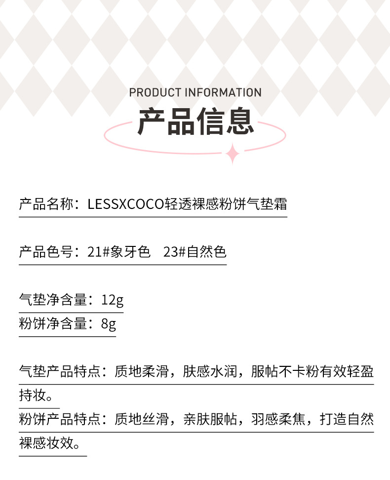产品介绍:粉饼气垫二合一小巧设计,外出携带不占位置,时刻保持通透奶雾肌妆效。上层粉饼,柔雾哑光,定妆服帖不拔干,控油匀净通透好妆感。下层专研保湿成分,多重精粹入妆,面霜级养肤,上妆自然轻薄,隐匿毛孔,遮盖痘痕,净透裸光肌。一盒搞定上妆+定妆+补妆,轻松打造精致服帖自然裸妆。
