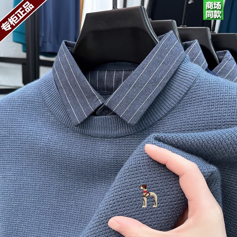 2025商务长袖毛衣男士秋冬新款拼接假两件条纹翻领针织休闲毛衫
