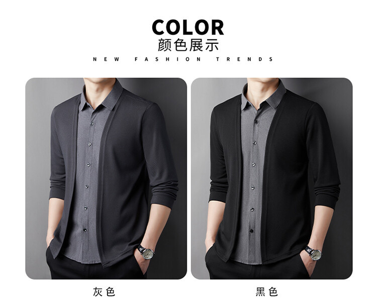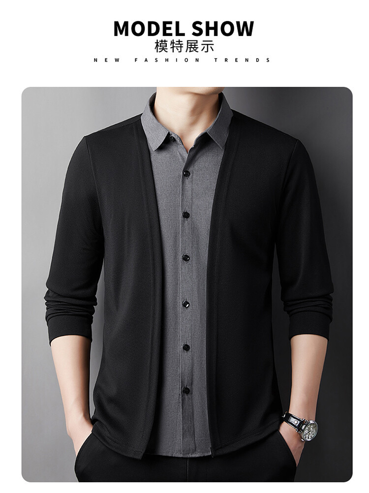 春秋季男士高档假两件薄款毛衣开衫外套衬衫新款翻领中青年上青