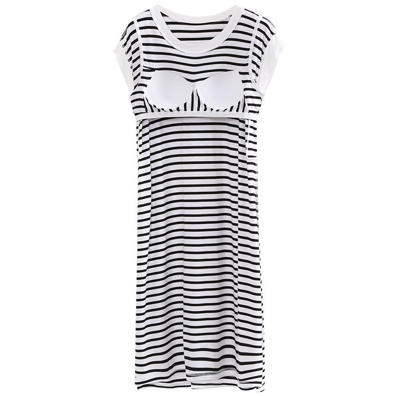 寝ているスカートの女性の夏の薄いタイプの袖なしのベストの大きいサイズの太ったmm200斤のゆったりしたストライプのパジャマは胸のパッドの家の服を持ちます。