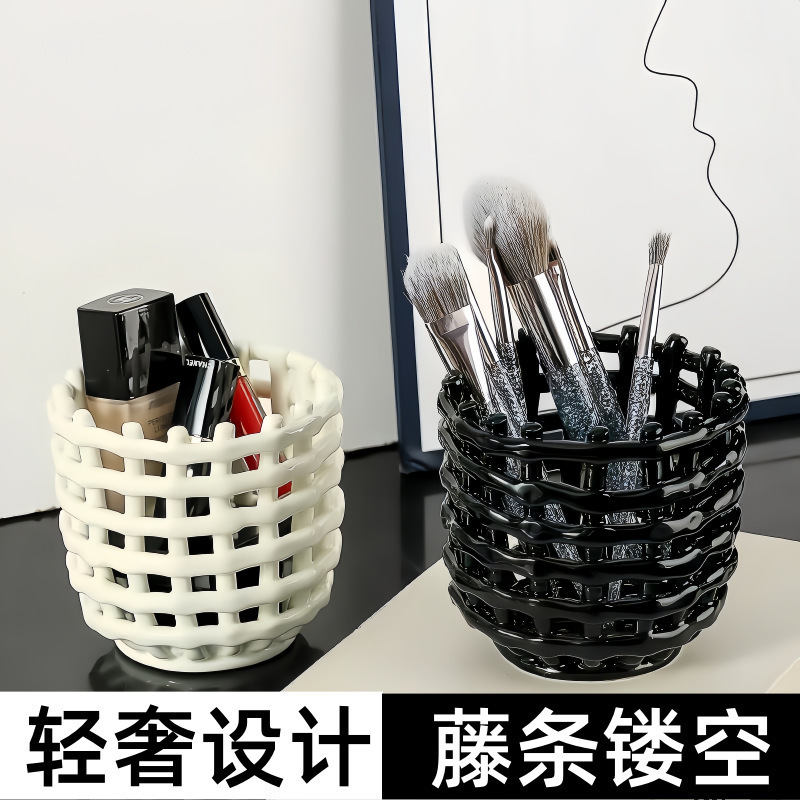 ins塑料编织收纳筒桌面收纳盒化妆刷梳子筷子沥水架桌面收纳桶筐