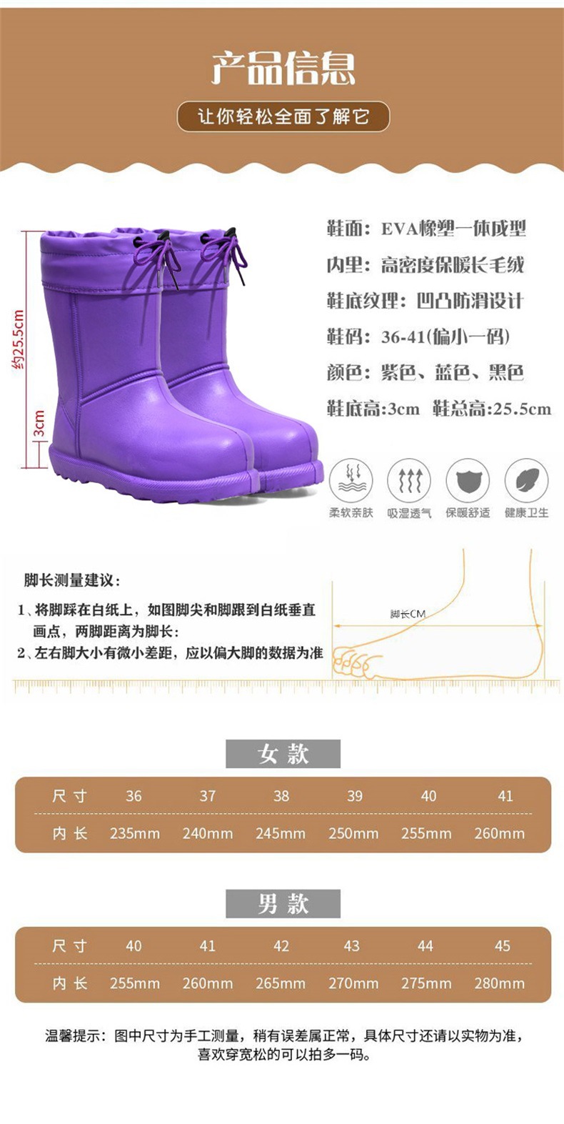 冬季加绒加厚雨鞋EVA轻便防滑防水鞋加厚鞋底防寒保暖雪地靴男