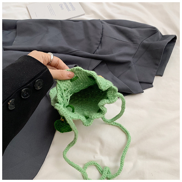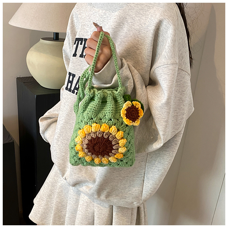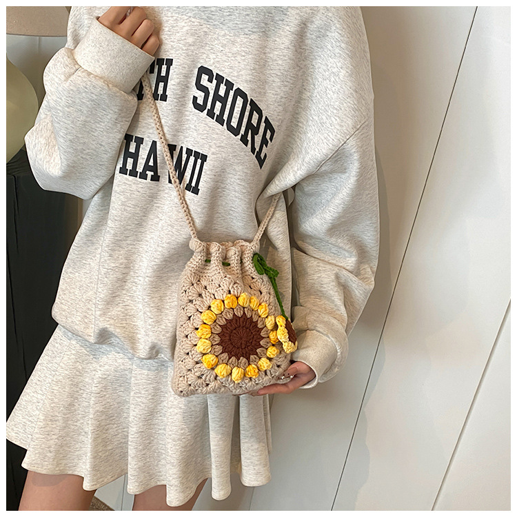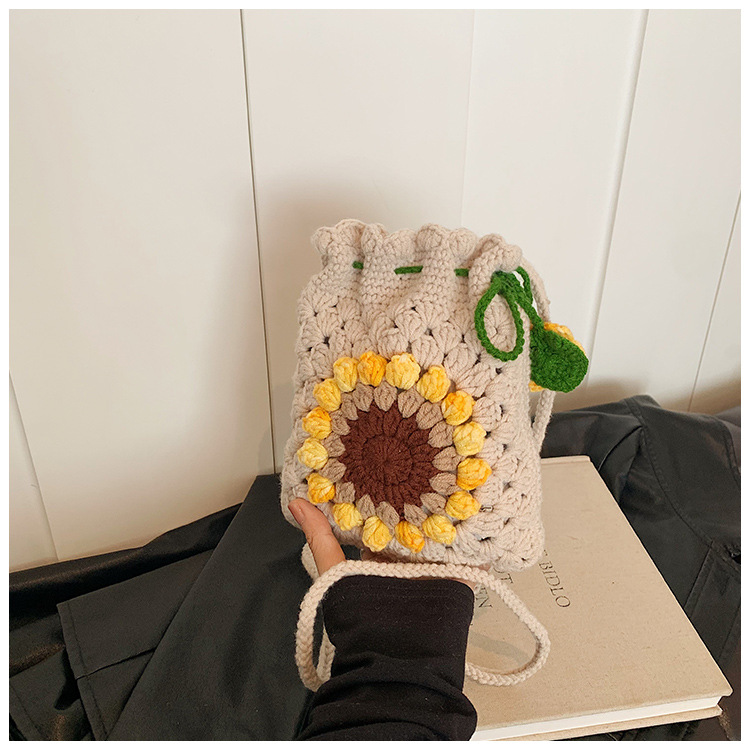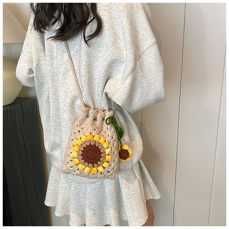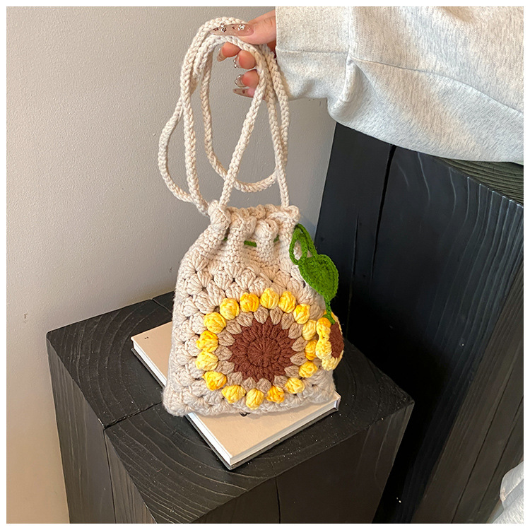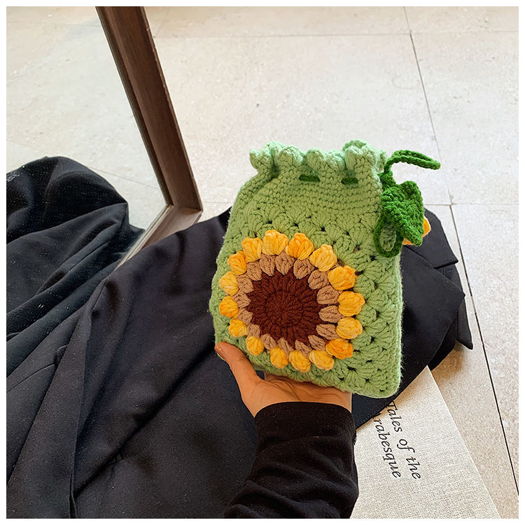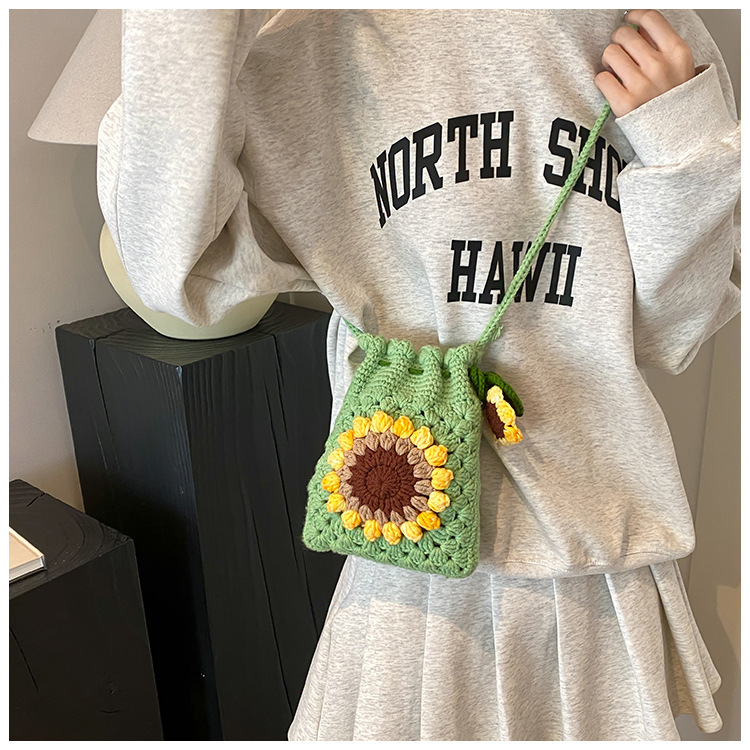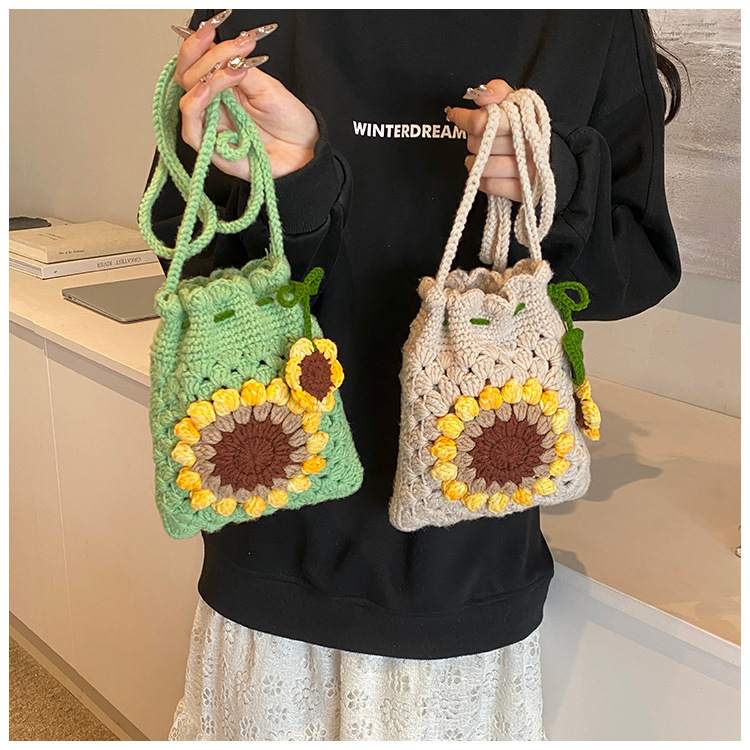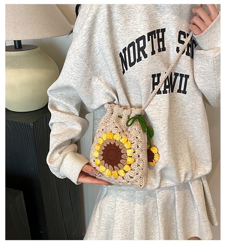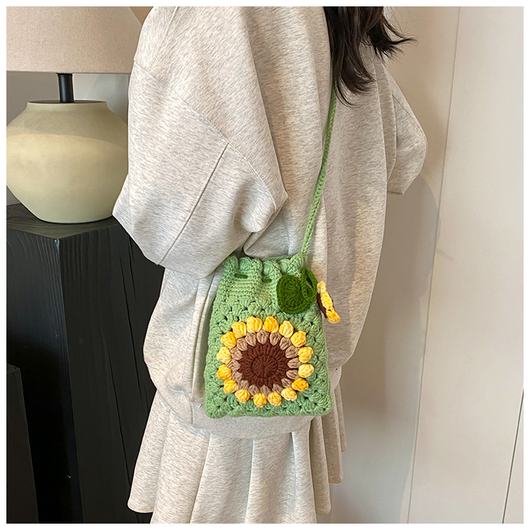 2026年新作 ニット糸バッグ レディース かぎ針編み ひまわり ドローストリング モバイルバッグ 編み込み ショルダー 斜めがけ バケットバッグ