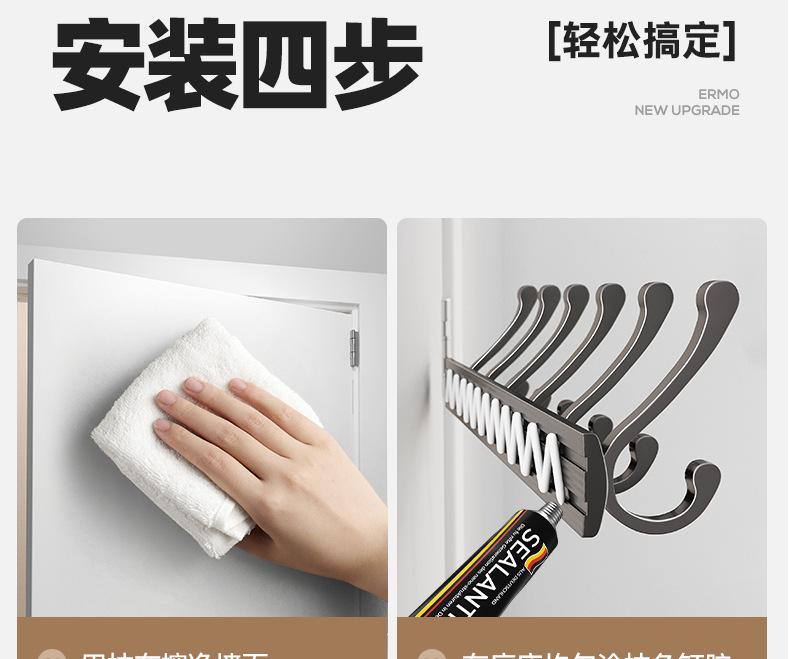 ハンガーを掛けて壁のドアを掛けた後、フックを掛けて穴を開けないで玄関にフックを貼り付けます。