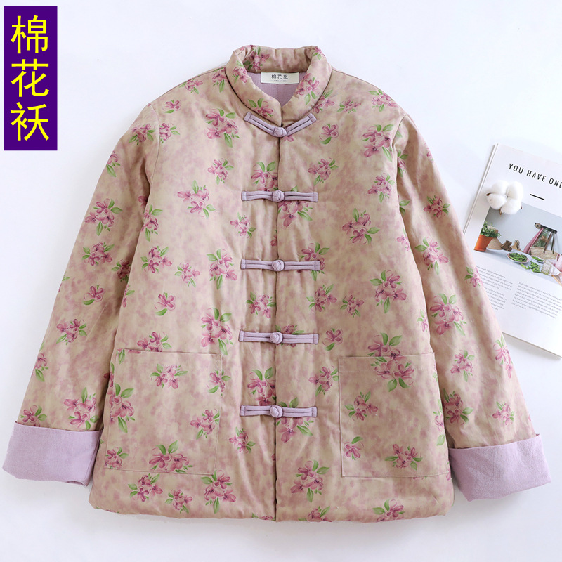 新款复古文艺棉服女立领盘扣印花棉衣外套冬季保暖宽松国风棉袄