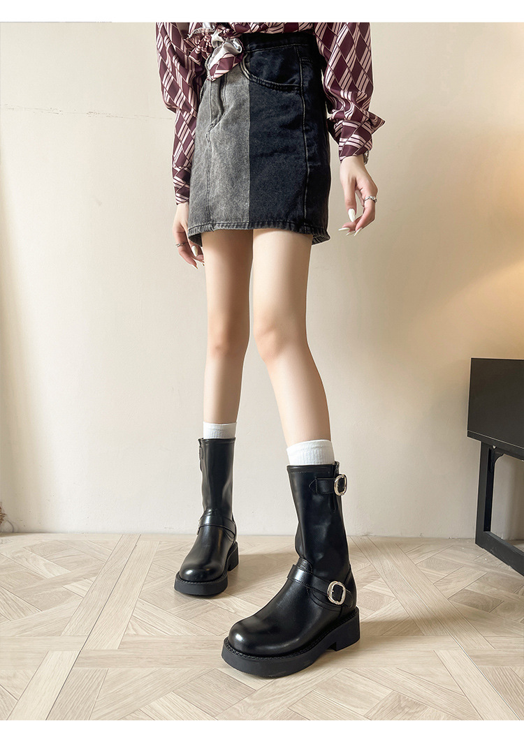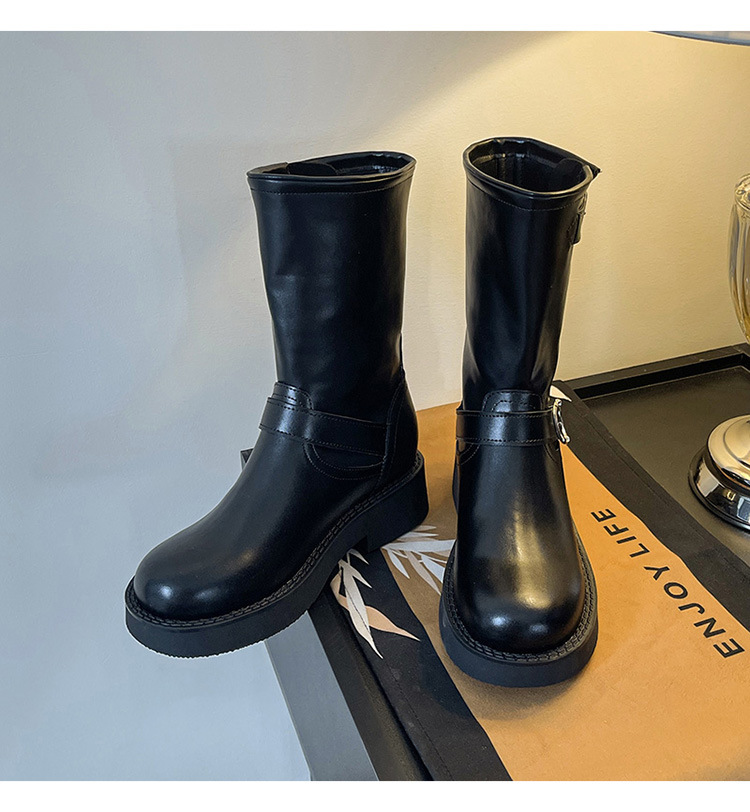 女性用インナーハイトップブーツ 2025 秋冬新作 ブラック フロントジッパー付き 膝下までのミドル丈ブーツ 小柄な人向け